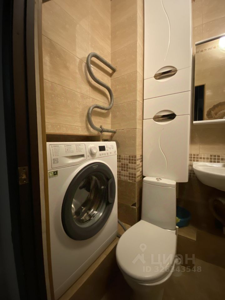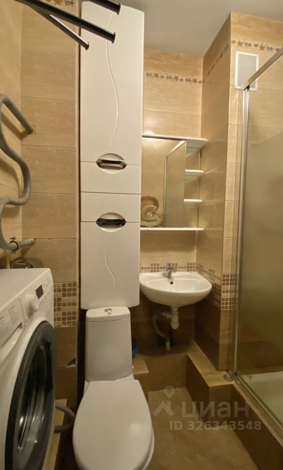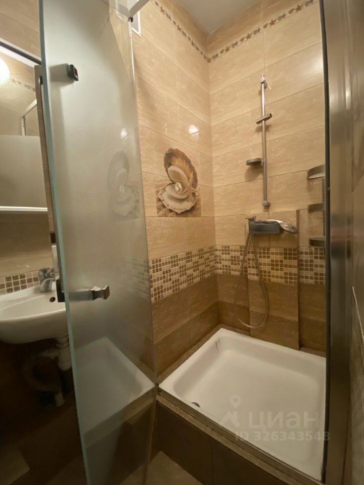 Оснащение: диван раскладной 2 шт., шкаф для одежды, стол, 2 стула, кухонная мебель, варочная поверхность, вытяжка, микроволновая печь, холодильник, стол барный, стулья барные 2 шт., в коридоре - шкаф для одежды и обуви, санузел совмещенный, здесь - душевая кабина, стиральная машина.