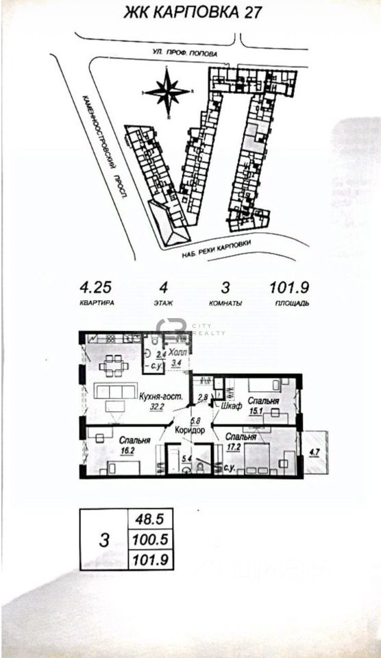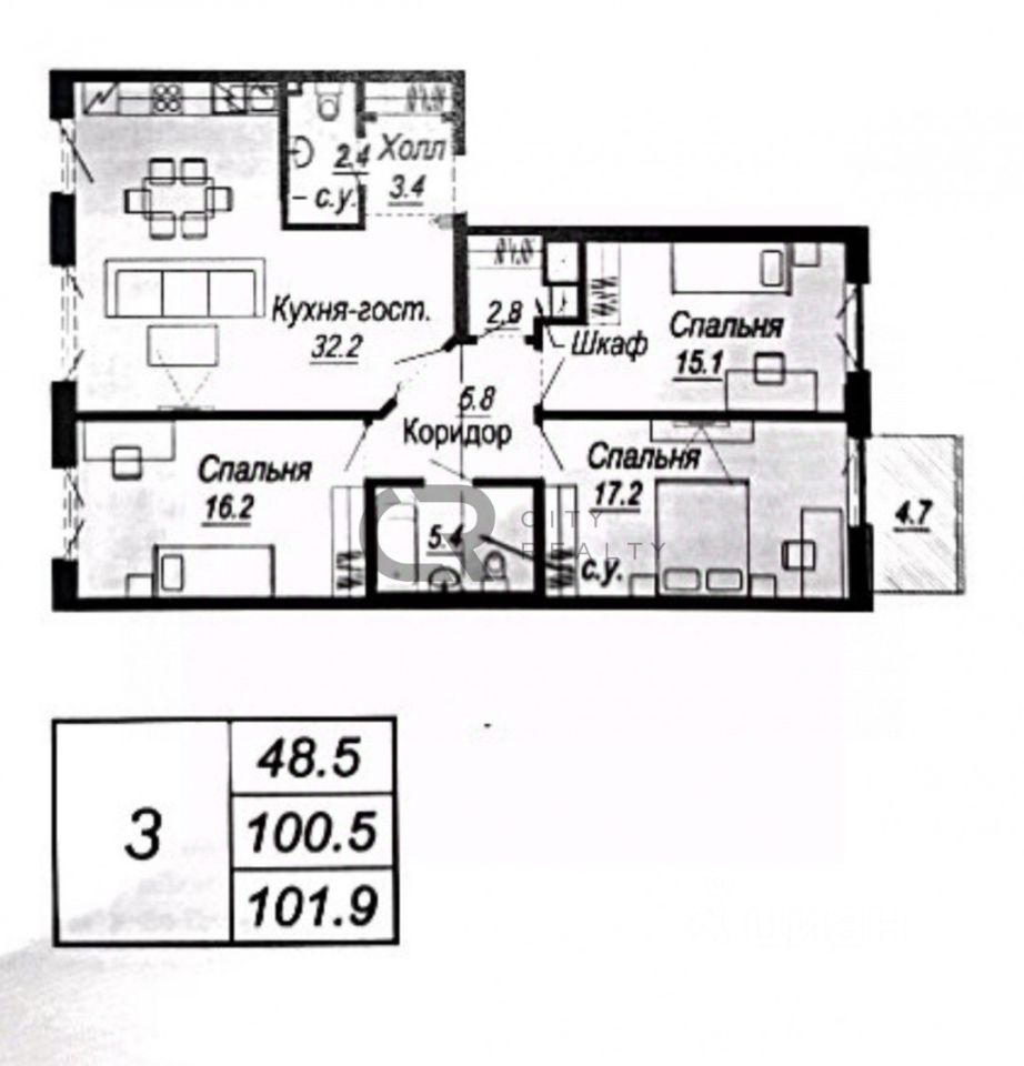 Площадь квартиры исполнена максимально рационально: Кухня-гостиная 32.2 м2 Спальня с балконом 17.2м2+4,7м2 Вторая спальня 15.1м2 Третья спальня 16.2 м2 Санузел с ванной 5.4м2 Санузел 2.4 м2