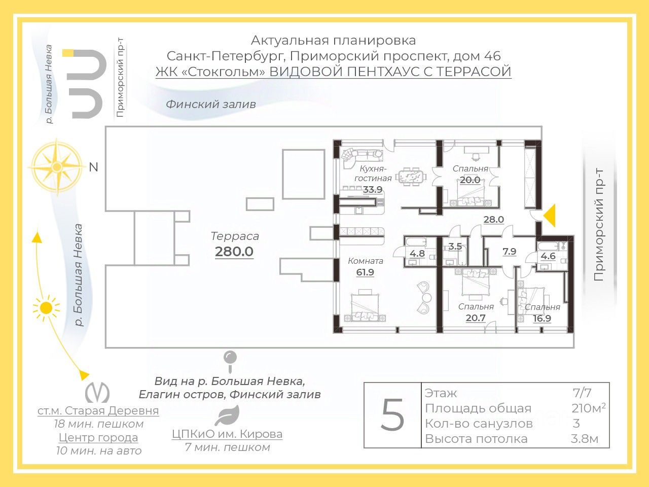 Предлагается к продаже видовой пентхаус в жилом комплексе ''Stockholm'', расположенном на берегу Большой Невки -одной из самых привлекательных локаций Приморскогоо района.