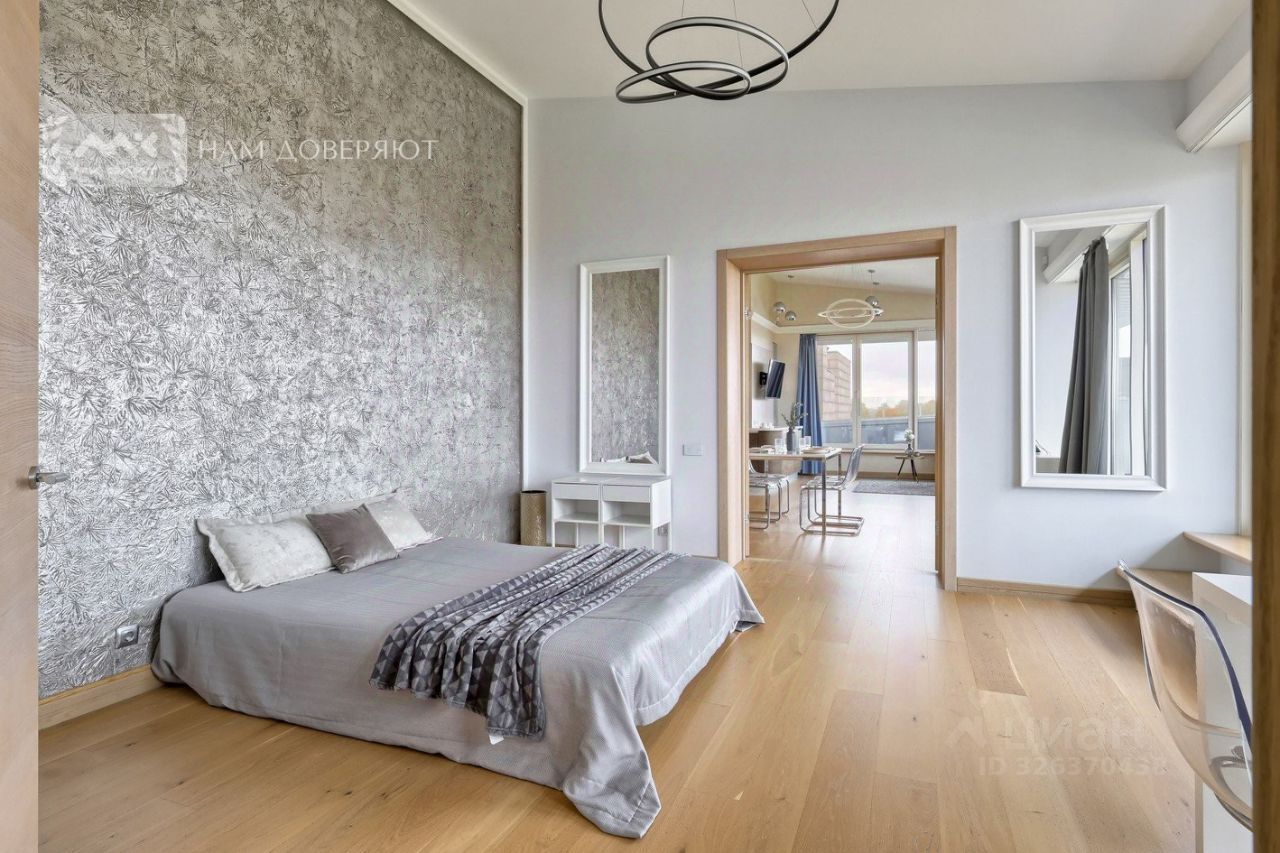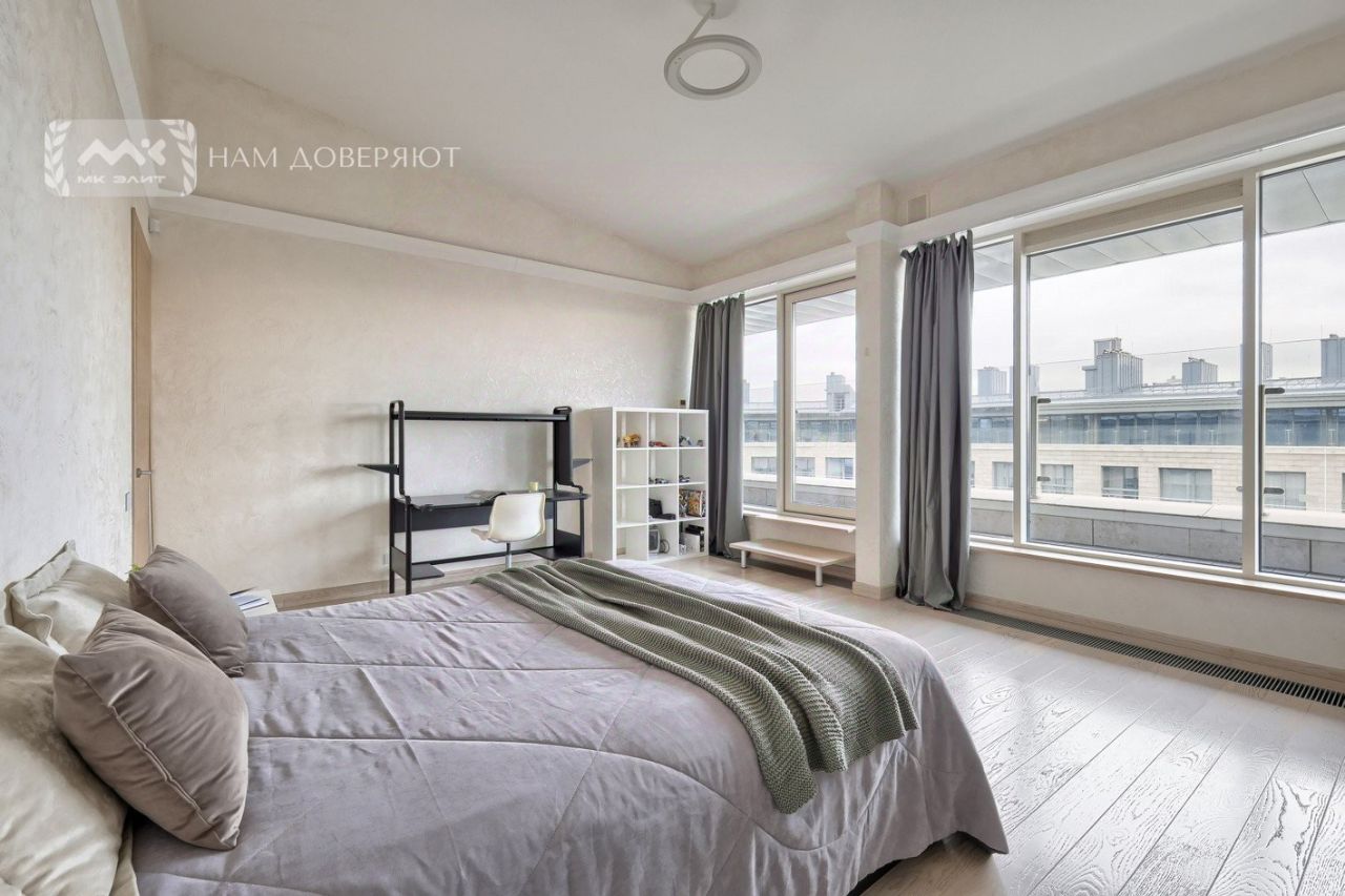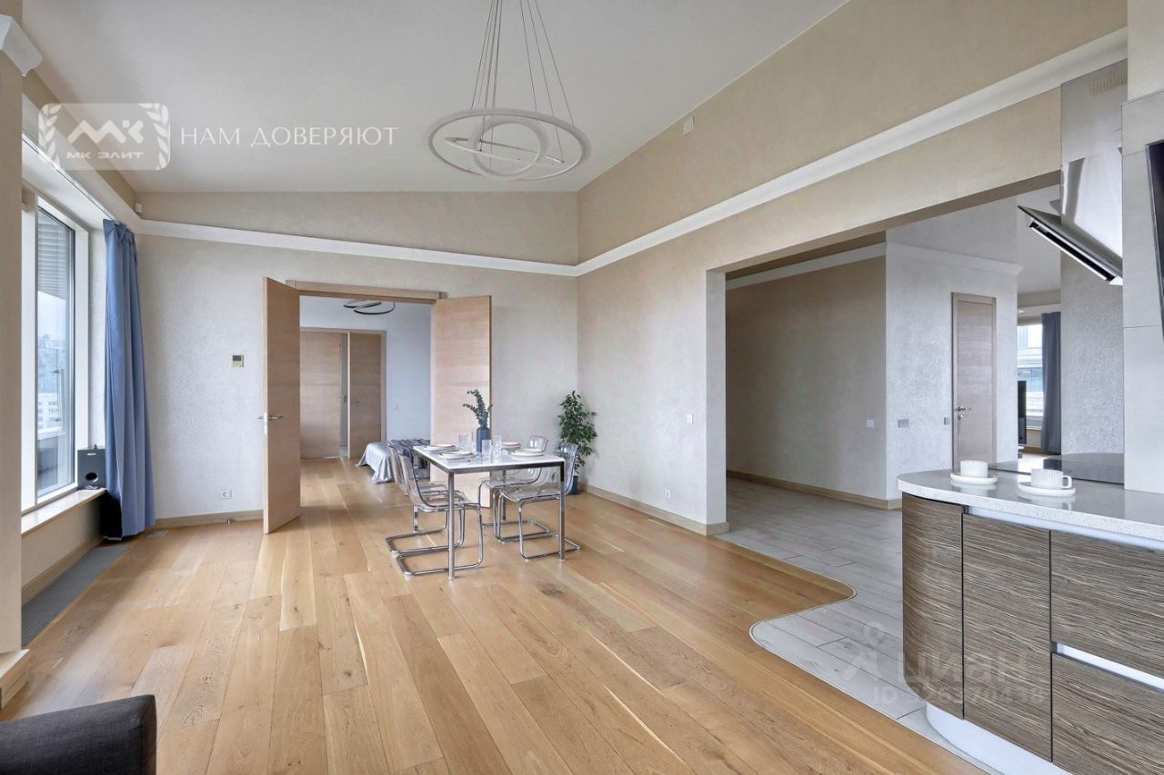 Трудно будет найти более светлую и солнечную квартиру. На данный момент планировка квартиры состоит из кухни-гостиной 96 кв. м, трех спален 21, 20 и 17 кв. м. При желании, в квартире можно выделить до 5 изолированных спален. Также в квартире есть три санузла и кладовка. В квартире выполнен ремонт в минималистичном современном стиле. Высота потолков достигает 3.8 м!