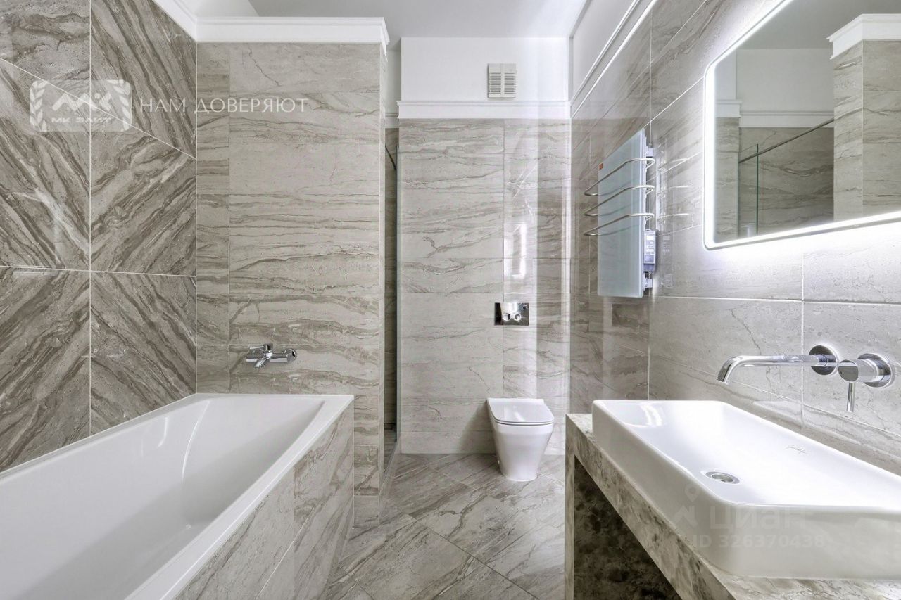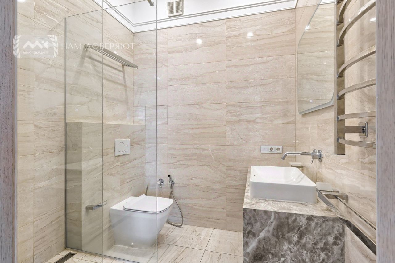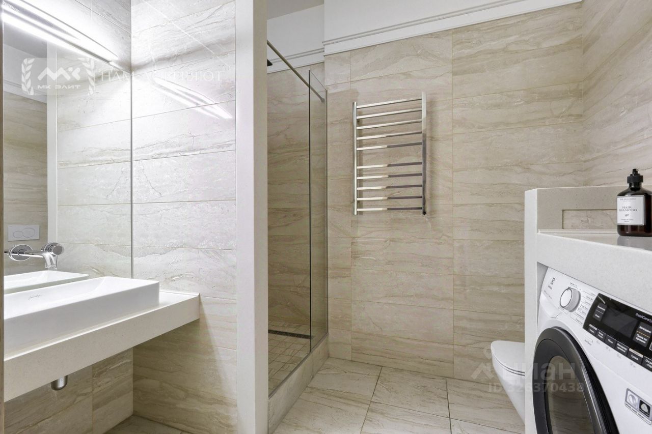 Трудно будет найти более светлую и солнечную квартиру. На данный момент планировка квартиры состоит из кухни-гостиной 96 кв. м, трех спален 21, 20 и 17 кв. м. При желании, в квартире можно выделить до 5 изолированных спален. Также в квартире есть три санузла и кладовка. В квартире выполнен ремонт в минималистичном современном стиле. Высота потолков достигает 3.8 м!