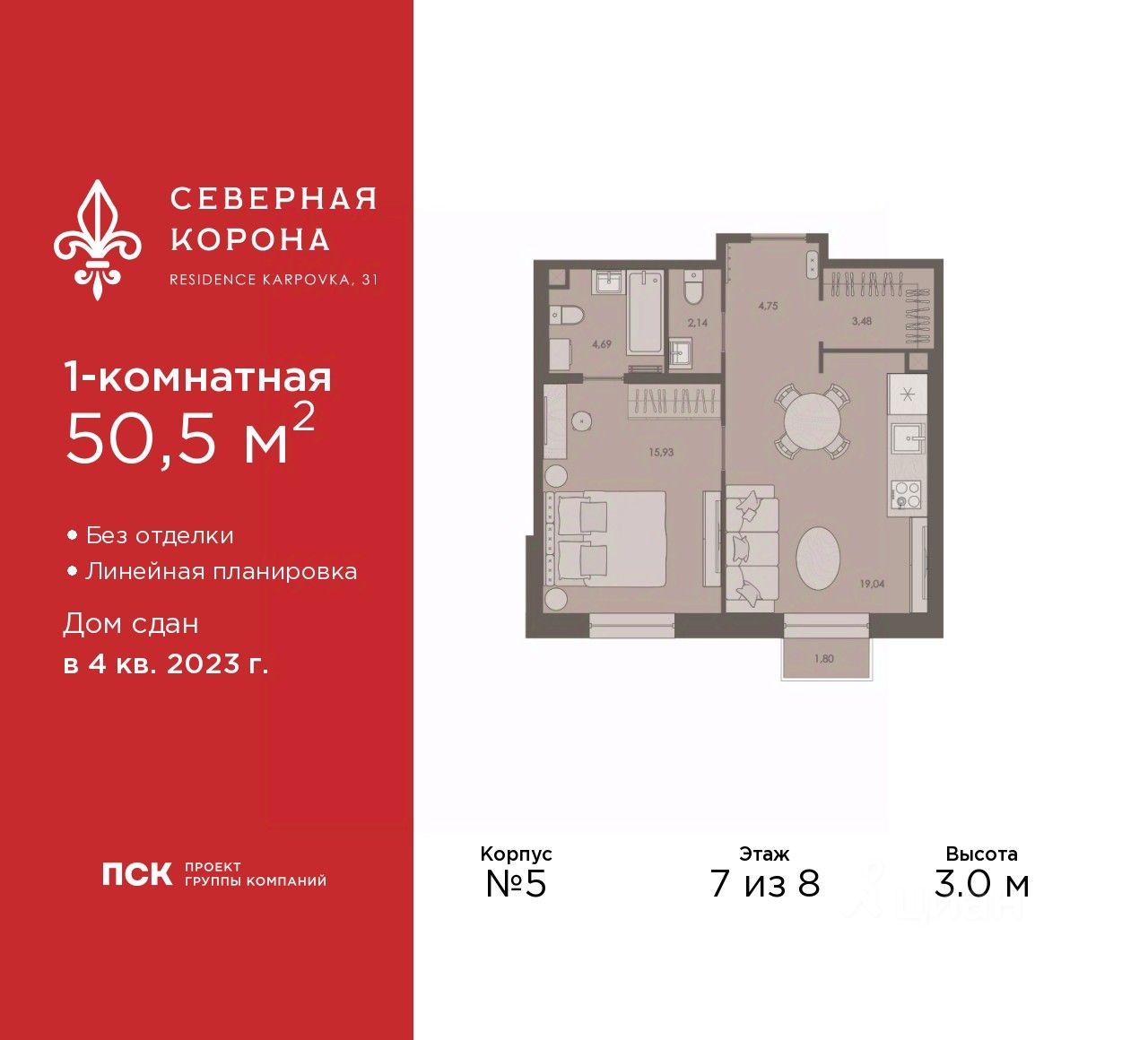 Продается однокомнатная квартира от застройщика в ЖК ''Северная корона'' на 7 этаже. Квартира без отделки, после оформления собственности можно делать ремонт. Общая площадь: 50.5 кв.м., жилая: 15.93 кв.м., площадь просторной кухни-столовой: 19.04 кв.м. Все окна выходят на одну сторону. В квартире один балкон, один совмещенный и один раздельный санузел. Высота потолков 3.0 м.