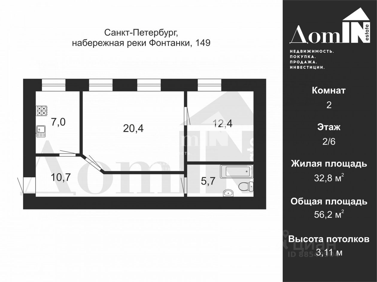 Арт. 129303472 Двухкомнатная квартира 56 квадратных метров на Фонтанке!