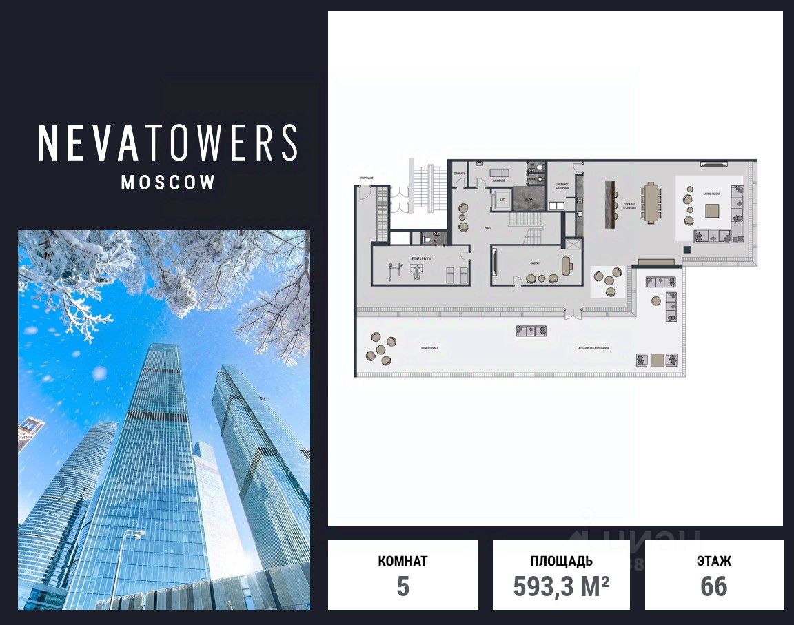 Предлагается апартамент с отделкой White Box в сданном и заселённом комплексе. Площадь — 593.3 м², 66 этаж, вид на башни Сити.