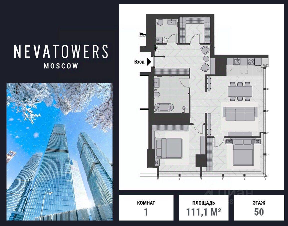 Предлагается апартамент с отделкой White Box в сданном и заселённом комплексе. Площадь — 111.1 м², 50 этаж, вид на башни Сити.