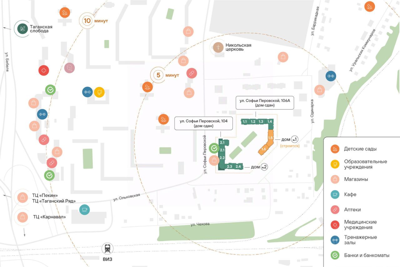 20 минут пешком до парка ''Таганская слобода'' 15 минут на машине до кольцевой дороги, а до центра — полчаса даже по пробкам 10 минут на машине до ТЦ ''Карнавал'' 7 школ и 11 детсадов поблизости 6 продуктовых магазинов рядом