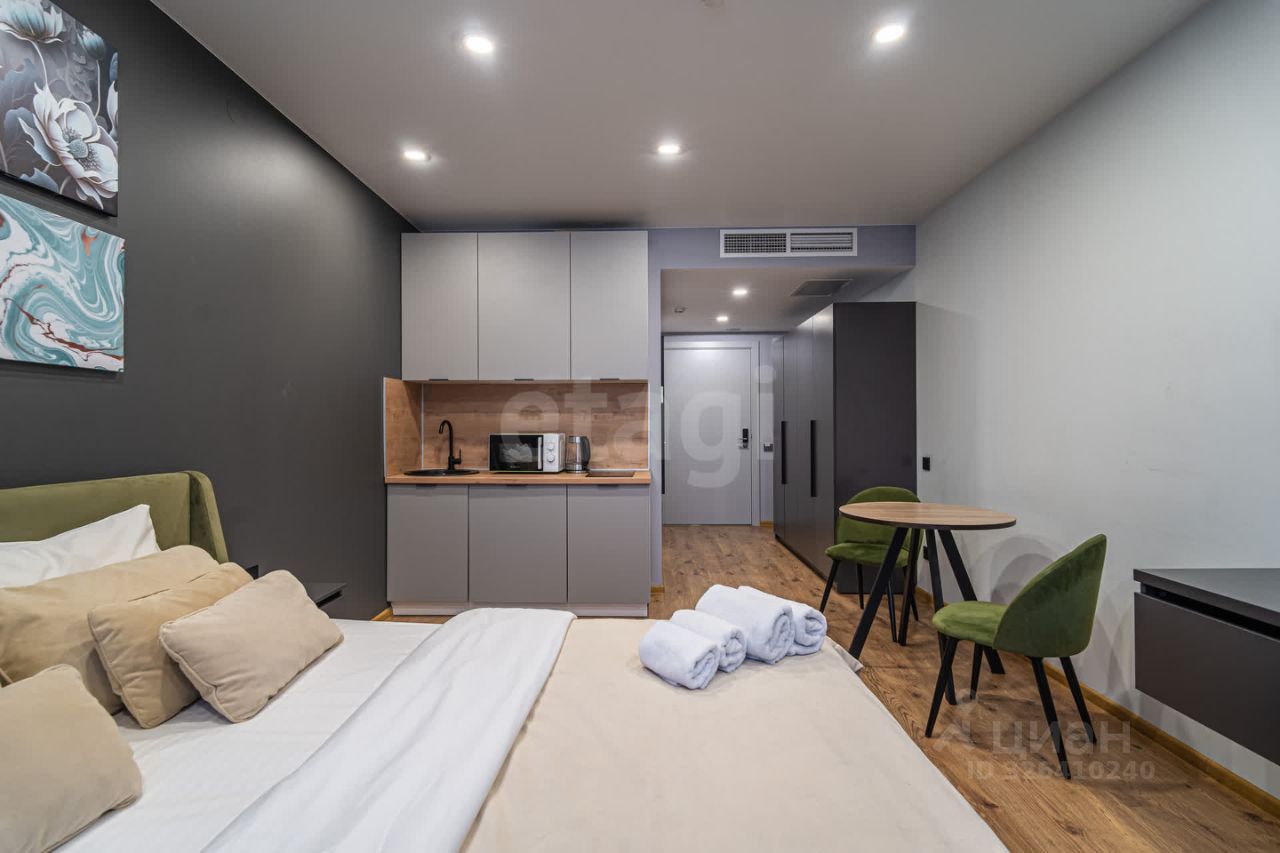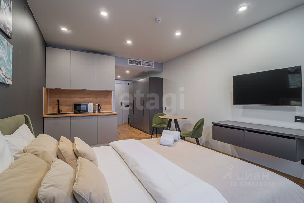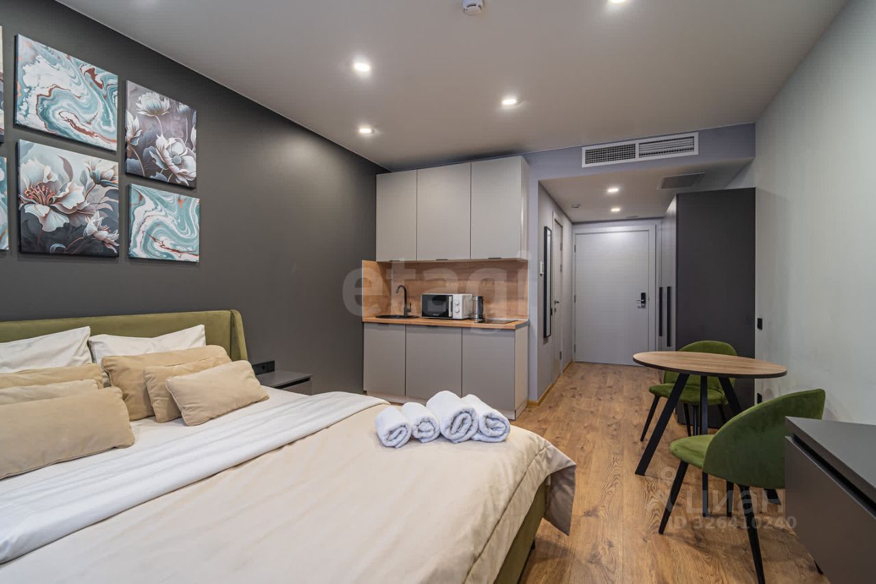 Апартамент 25,2 м²: 7 этаж, полная меблировка, техника, Smart TV, кондиционер, рабочая зона, стильная душевая, быстрый Wi-Fi, — всё готово для проживания или аренды.