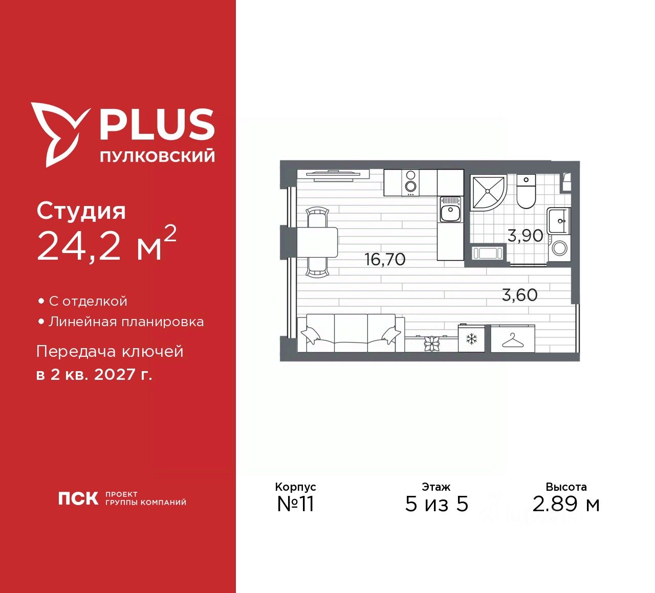 Просторная однокомнатная квартира-студия с отделкой в ЖК ''PLUS Пулковский'' на 5 этаже. Общая площадь: 24.2 кв.м., площадь гостиной 16.7 кв.м., из которых 5 кв.м. выделено под кухонную зону. Все окна выходят на одну сторону. В квартире один совмещенный санузел. Высота потолков 2.89 м.