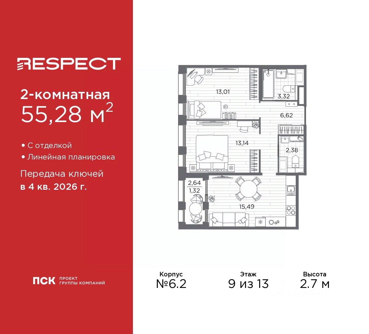 2-комн. квартира с отделкой в ЖК ''RESPECT'' на 9 этаже. Общая площадь: 55.28 кв.м., жилая: 26.15 кв.м., площадь просторной кухни-столовой: 15.49 кв.м. Комнаты изолированные, все окна выходят на одну сторону. В квартире одна лоджия, один совмещенный и один раздельный санузел. Высота потолков 2.7 м.