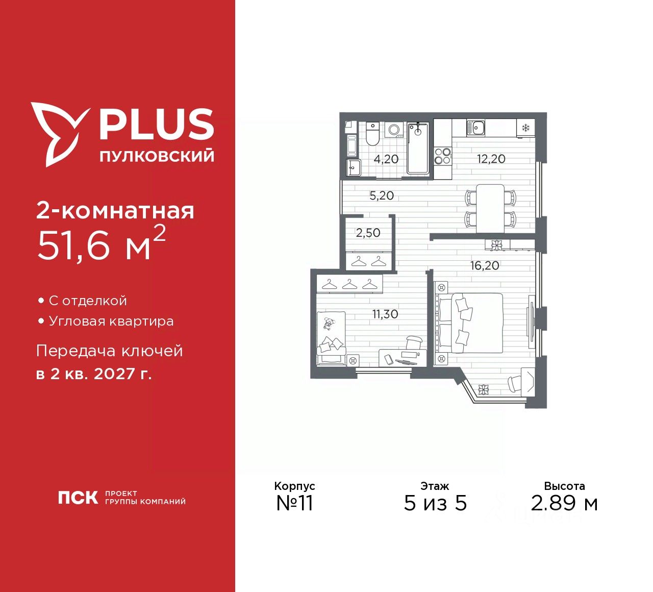 Двухкомнатная квартира с отделкой в ЖК ''PLUS Пулковский'' на 5 этаже. Общая площадь: 51.6 кв.м., жилая: 27.5 кв.м., площадь просторной кухни-столовой: 12.2 кв.м. Угловая квартира, идеально подойдет любителям тишины и панорамных видов. В квартире один совмещенный санузел. Высота потолков 2.89 м.