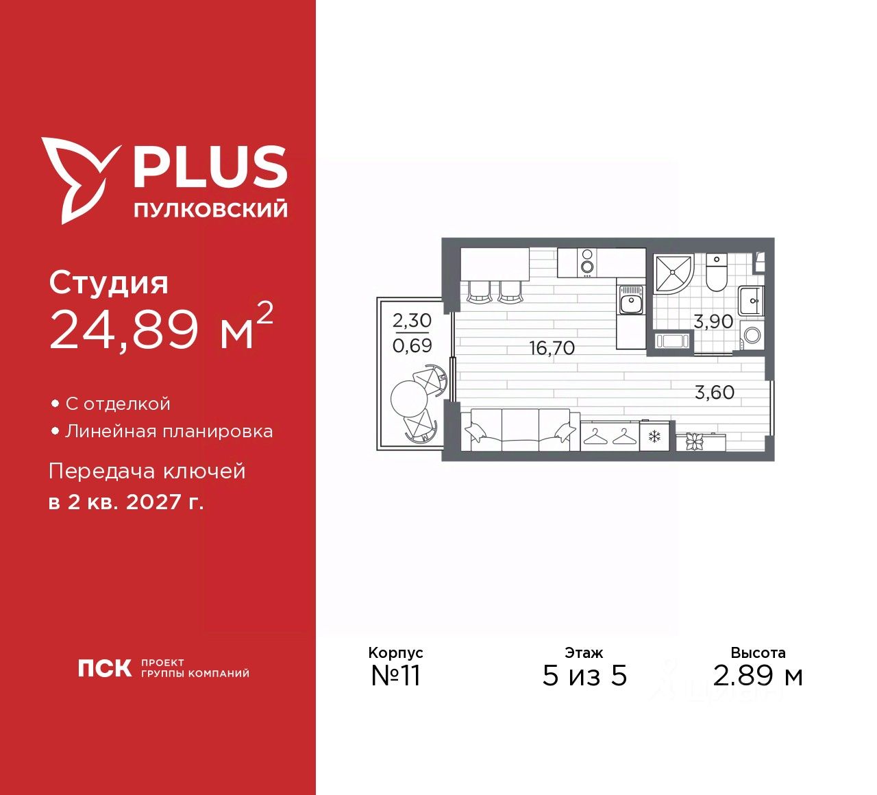 Продается 1-комн. квартира-студия с отделкой в ЖК ''PLUS Пулковский'' на 5 этаже. Общая площадь: 24.89 кв.м., площадь гостиной 16.7 кв.м., из которых 5 кв.м. выделено под кухонную зону. Все окна выходят на одну сторону. В квартире один балкон, один совмещенный санузел. Высота потолков 2.89 м.
