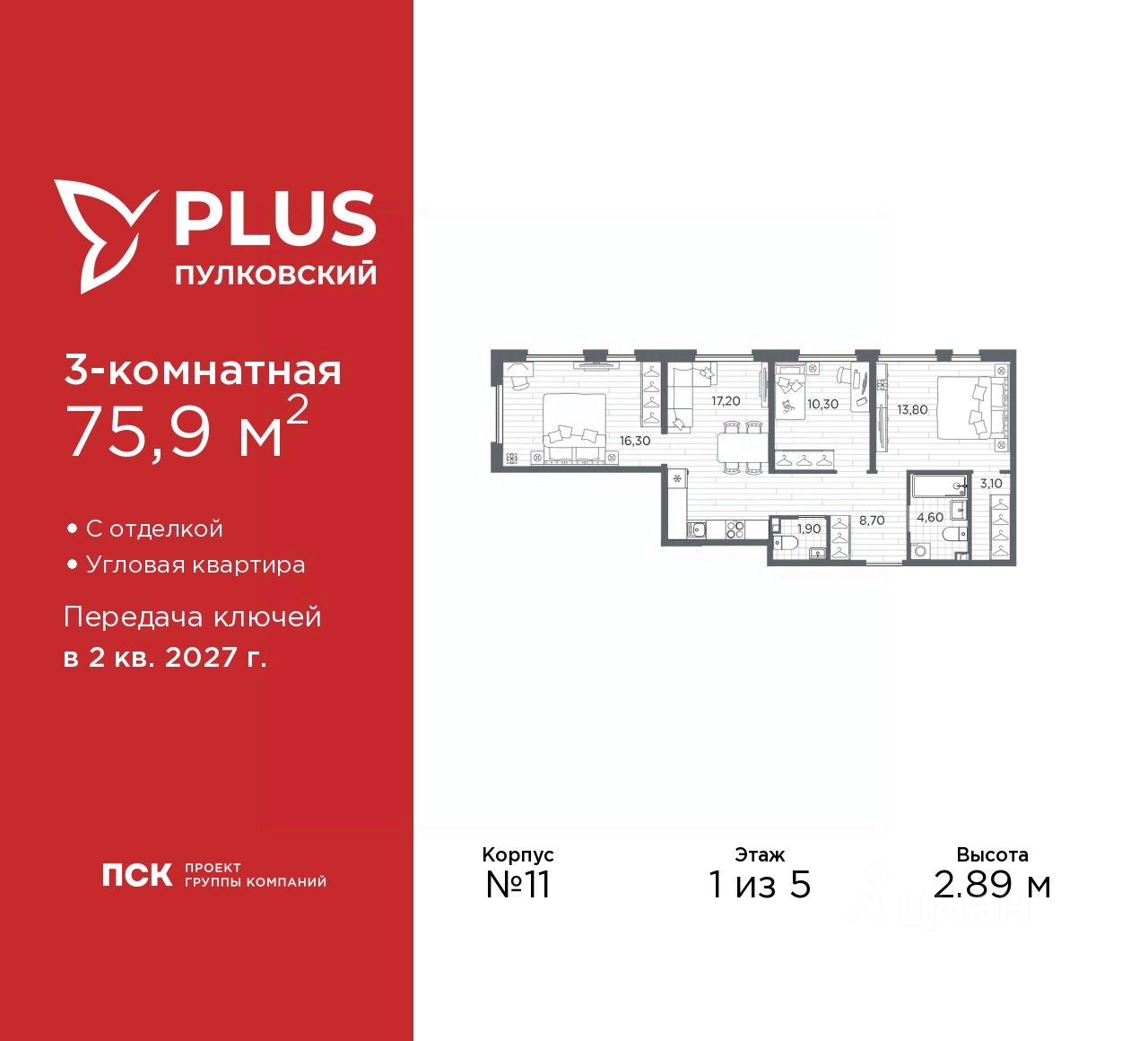 Трехкомнатная квартира с отделкой в ЖК ''PLUS Пулковский'' на 1 этаже. Общая площадь: 75.9 кв.м., жилая: 40.4 кв.м., площадь просторной кухни-столовой: 17.2 кв.м. Квартира угловая, окна oбecпeчивaют paвнoмepнoe ocвeщeниe в тeчeниe дня. В квартире один совмещенный и один раздельный санузел. Высота потолков 2.89 м.