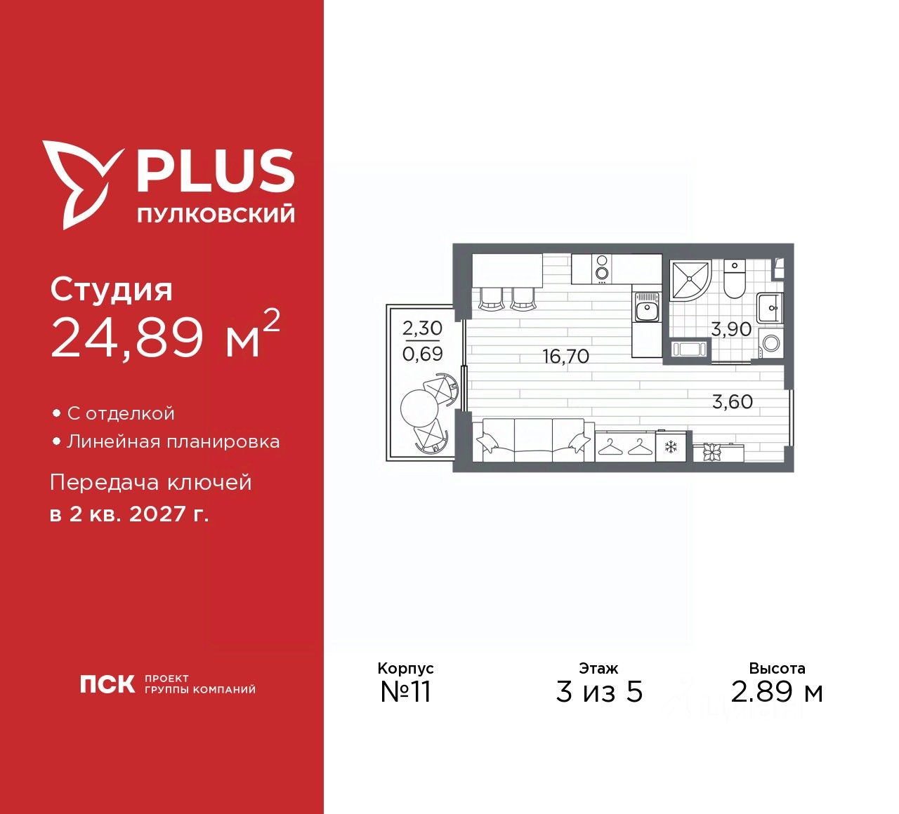 Продается однокомнатная квартира-студия от застройщика с отделкой в ЖК ''PLUS Пулковский'' на 3 этаже. Общая площадь: 24.89 кв.м., площадь гостиной 16.7 кв.м., из которых 5 кв.м. выделено под кухонную зону. Все окна выходят на одну сторону. В квартире один балкон, один совмещенный санузел. Высота потолков 2.89 м.