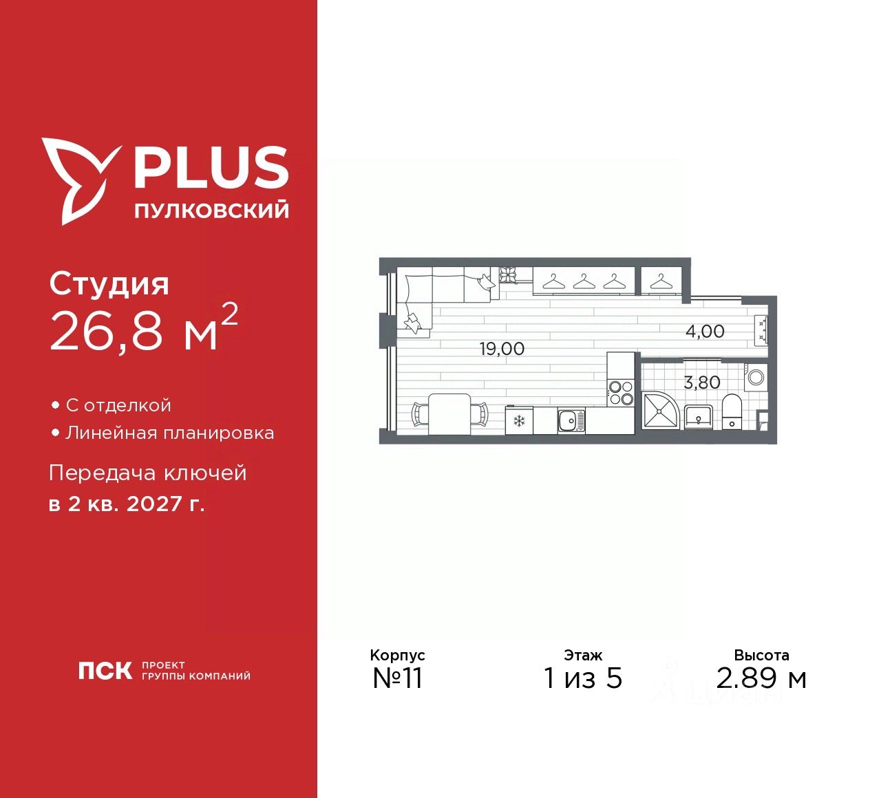 Просторная 1-комн. квартира-студия с отделкой в ЖК ''PLUS Пулковский'' на 1 этаже. Общая площадь: 26.8 кв.м., площадь гостиной 19 кв.м., из которых 5 кв.м. выделено под кухонную зону. Все окна выходят на одну сторону. В квартире один совмещенный санузел. Высота потолков 2.89 м.