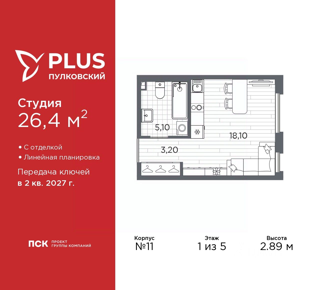 Продается 1-комн. квартира-студия с отделкой в ЖК ''PLUS Пулковский'' на 1 этаже. Общая площадь: 26.4 кв.м., площадь гостиной 16.1 кв.м., из которых 5 кв.м. выделено под кухонную зону. Все окна выходят на одну сторону. В квартире один совмещенный санузел. Высота потолков 2.89 м.