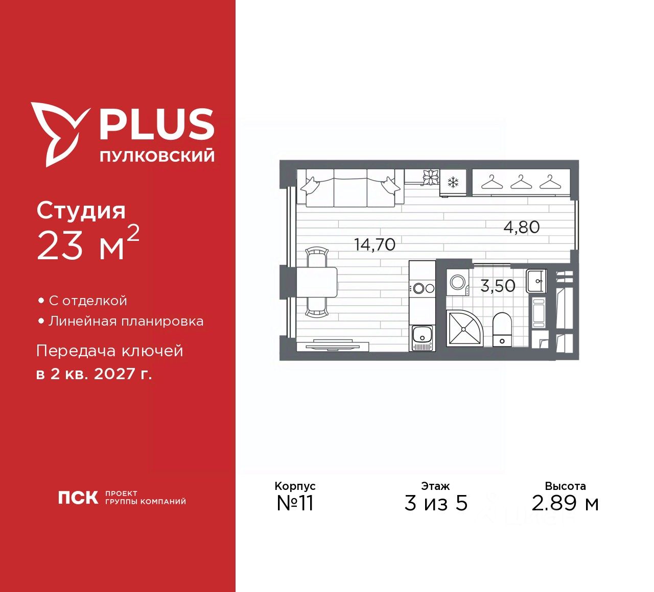 Просторная 1-комн. квартира-студия с отделкой в ЖК ''PLUS Пулковский'' на 3 этаже. Общая площадь: 23 кв.м., площадь гостиной 14.7 кв.м., из которых 5 кв.м. выделено под кухонную зону. Все окна выходят на одну сторону. В квартире один совмещенный санузел. Высота потолков 2.89 м.