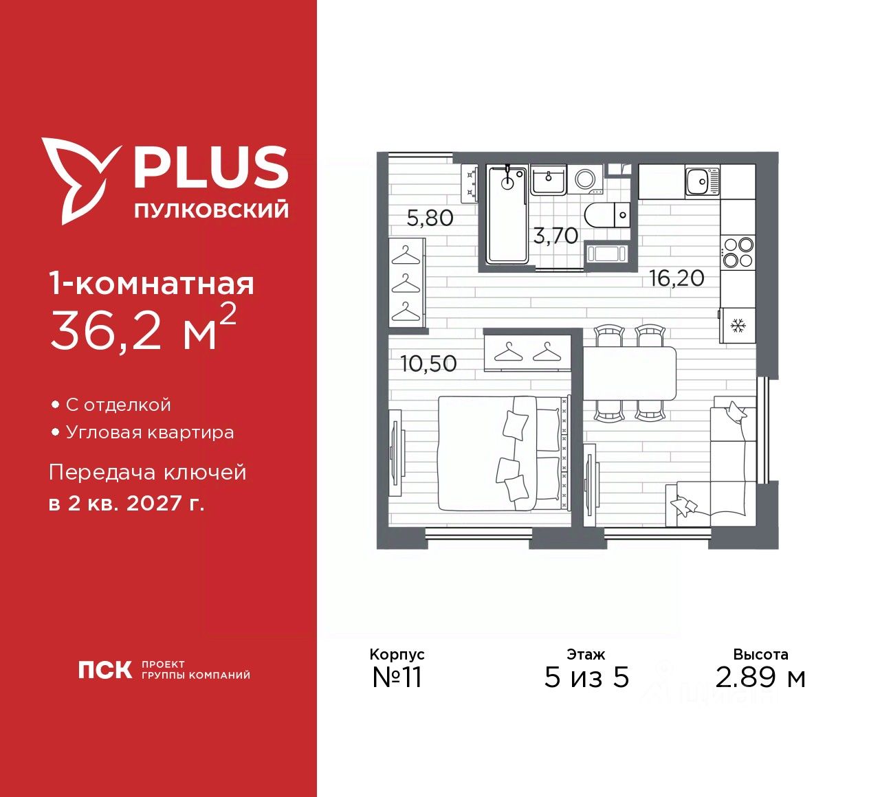Просторная 1-комн. квартира с отделкой в ЖК ''PLUS Пулковский'' на 5 этаже. Общая площадь: 36.2 кв.м., жилая: 10.5 кв.м., площадь просторной кухни-столовой: 16.2 кв.м. Угловая квартира, окна oбecпeчивaют paвнoмepнoe ocвeщeниe в тeчeниe дня. В квартире один совмещенный санузел. Высота потолков 2.89 м.