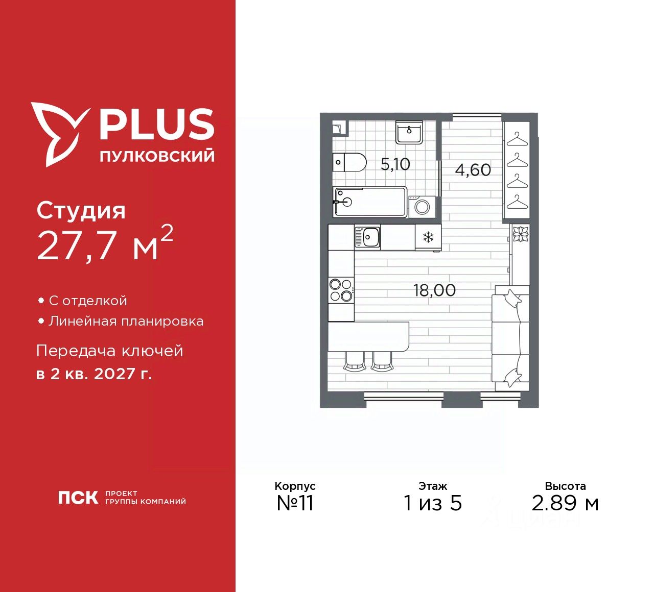 1-комн. квартира-студия от застройщика с отделкой в ЖК ''PLUS Пулковский'' на 1 этаже. Общая площадь: 27.7 кв.м., площадь гостиной 18 кв.м., из которых 5 кв.м. выделено под кухонную зону. Все окна выходят на одну сторону. В квартире один совмещенный санузел. Высота потолков 2.89 м.