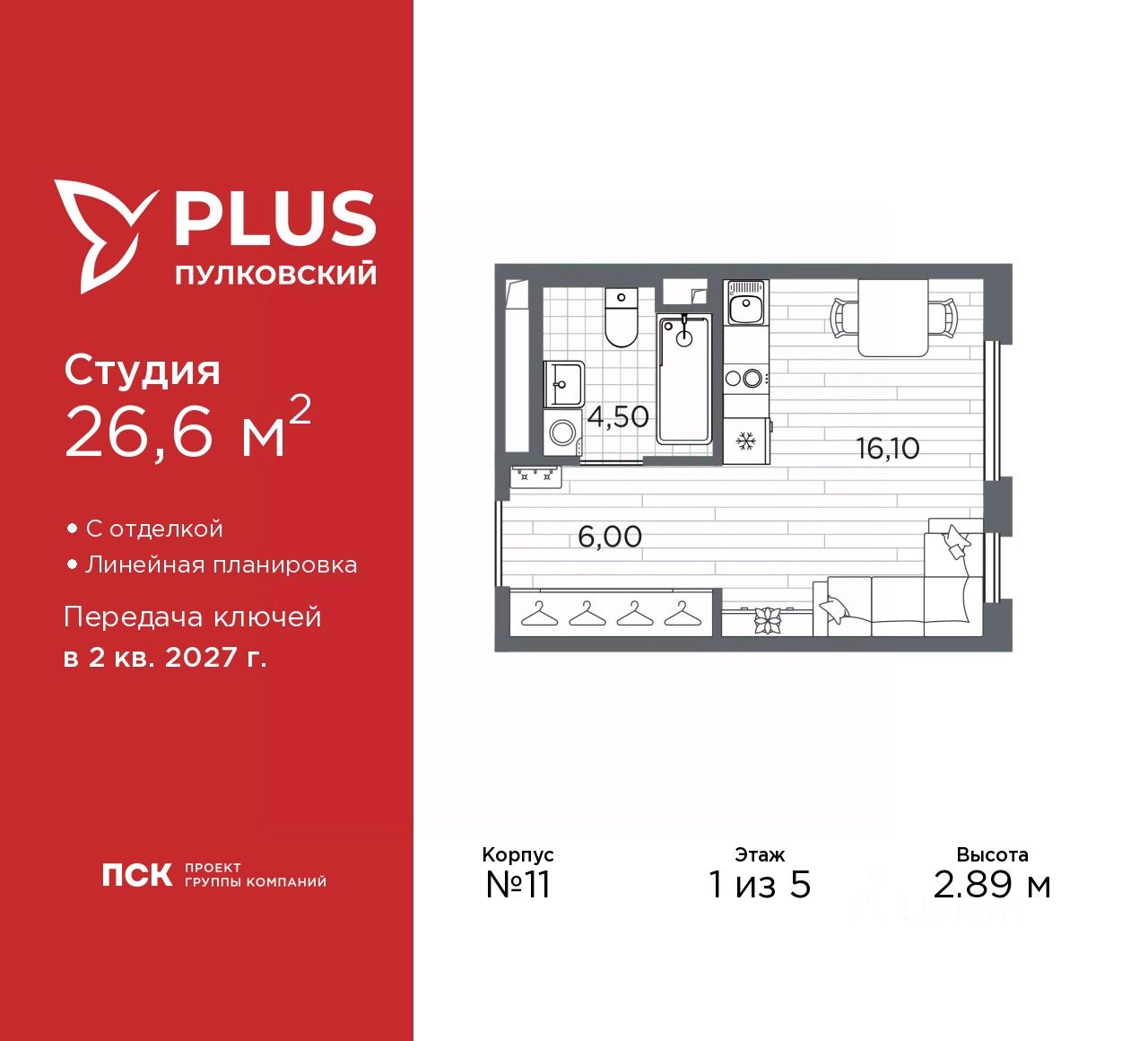 1-комн. квартира-студия от застройщика с отделкой в ЖК ''PLUS Пулковский'' на 1 этаже. Общая площадь: 26.6 кв.м., площадь гостиной 16.1 кв.м., из которых 5 кв.м. выделено под кухонную зону. Все окна выходят на одну сторону. В квартире один совмещенный санузел. Высота потолков 2.89 м.