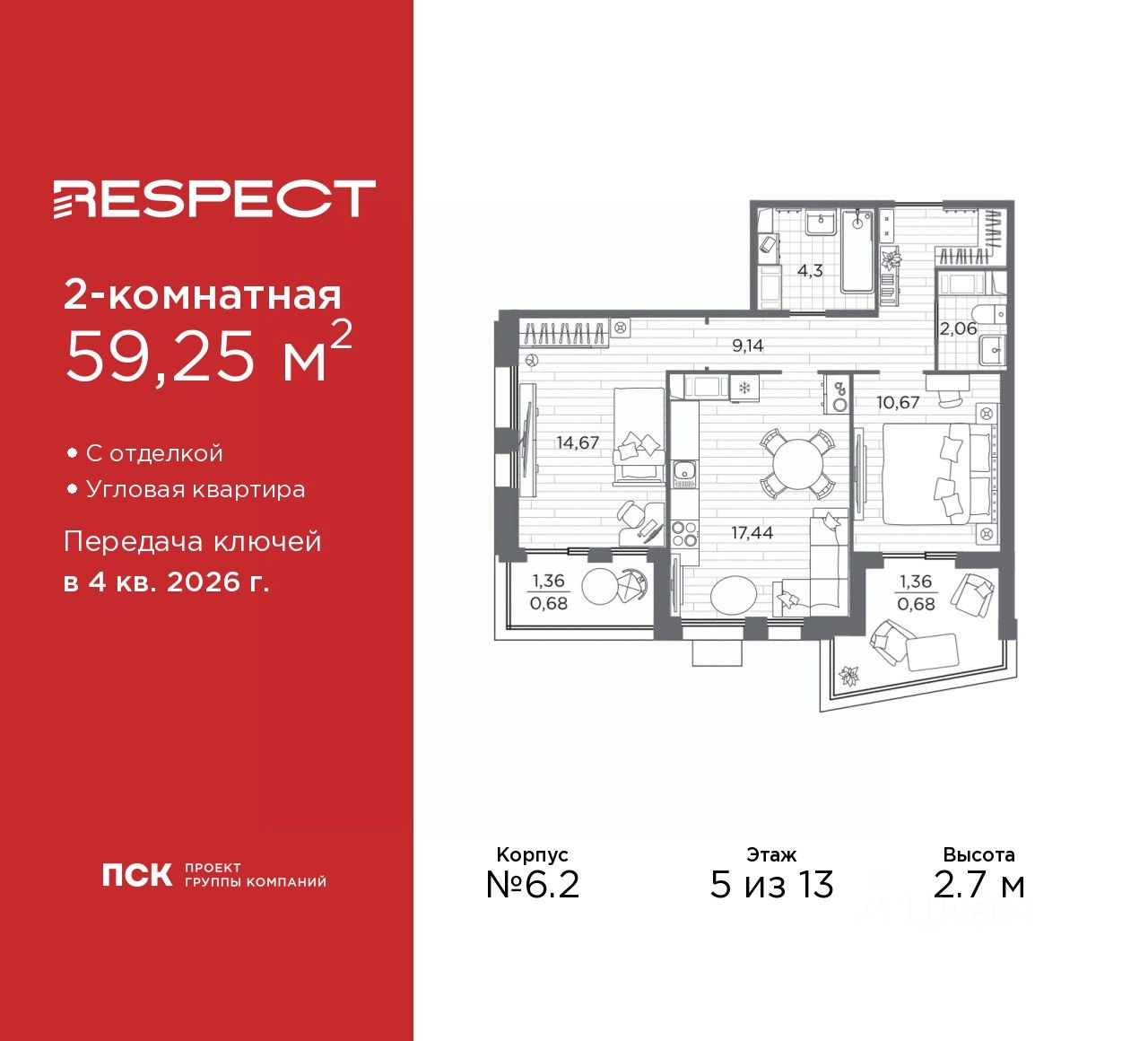 Просторная двухкомнатная квартира с отделкой в ЖК ''RESPECT'' на 5 этаже. Общая площадь: 59.25 кв.м., жилая: 25.34 кв.м., площадь просторной кухни-столовой: 17.44 кв.м. Угловая квартира, идеально подойдет любителям тишины и панорамных видов. В квартире две лоджии, один совмещенный и один раздельный санузел. Высота потолков 2.7 м.