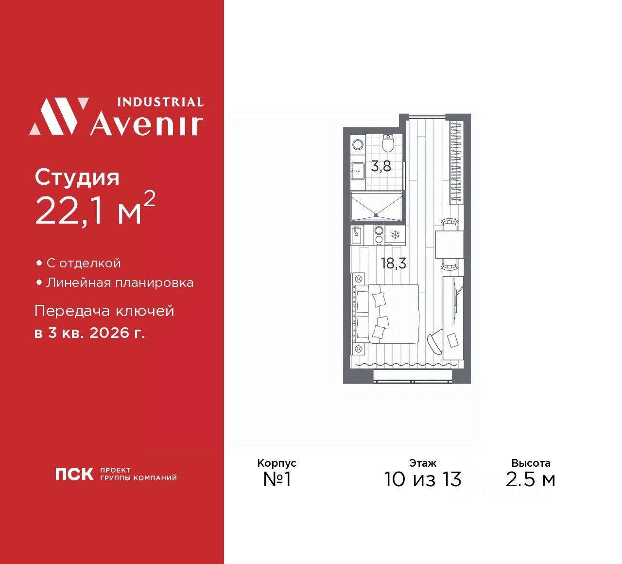 Продаются однокомнатные апартаменты-студия с отделкой в ЖК ''Industrial AVENIR'' на 10 этаже. Общая площадь: 22.1 кв.м., площадь гостиной 18.3 кв.м., из которых 5 кв.м. выделено под кухонную зону. Все окна выходят на одну сторону. В апартаментах один совмещенный санузел. Высота потолков 2.5 м.