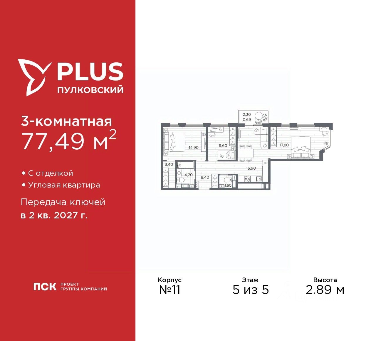 3-комн. квартира от застройщика с отделкой в ЖК ''PLUS Пулковский'' на 5 этаже. Общая площадь: 77.49 кв.м., жилая: 42.3 кв.м., площадь просторной кухни-столовой: 16.9 кв.м. Угловая квартира, идеально подойдет любителям тишины и панорамных видов. В квартире один балкон, один совмещенный и один раздельный санузел. Высота потолков 2.89 м.