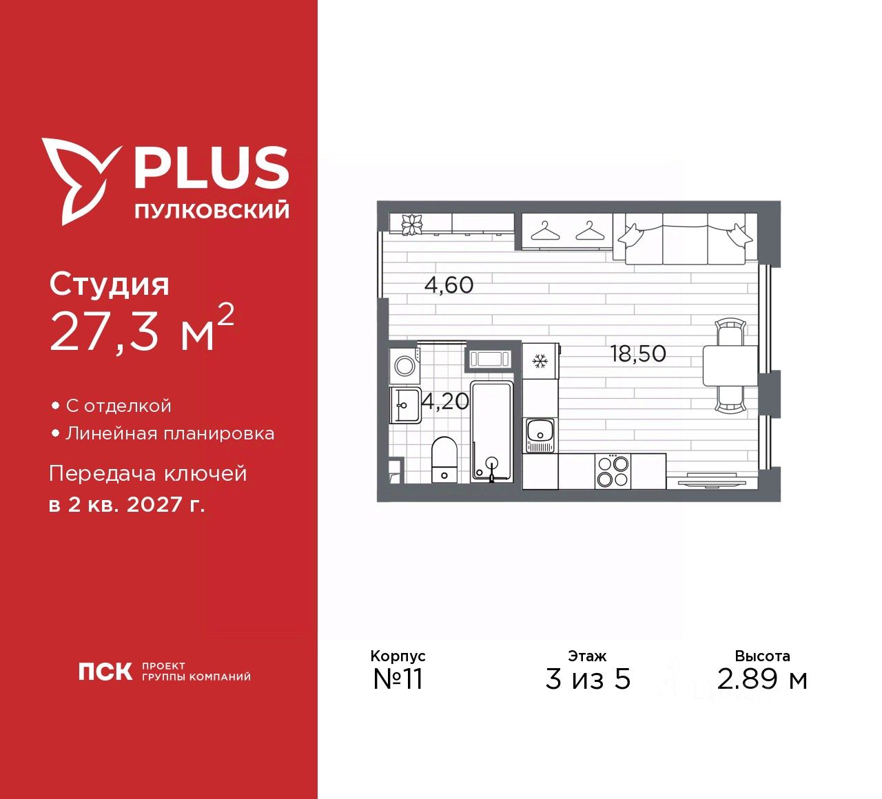 Продается 1-комн. квартира-студия с отделкой в ЖК ''PLUS Пулковский'' на 3 этаже. Общая площадь: 27.3 кв.м., площадь гостиной 18.5 кв.м., из которых 5 кв.м. выделено под кухонную зону. Все окна выходят на одну сторону. В квартире один совмещенный санузел. Высота потолков 2.89 м.