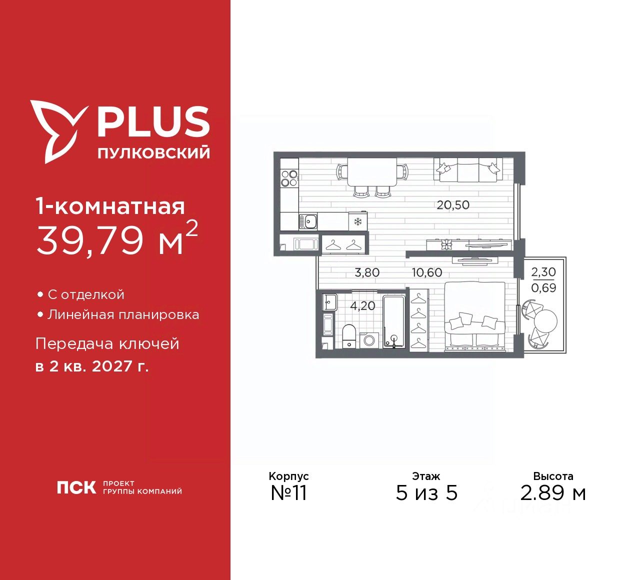 1-комн. квартира с отделкой в ЖК ''PLUS Пулковский'' на 5 этаже. Общая площадь: 39.79 кв.м., жилая: 10.6 кв.м., площадь просторной кухни-столовой: 20.5 кв.м. Все окна выходят на одну сторону. В квартире один балкон, один совмещенный санузел. Высота потолков 2.89 м.