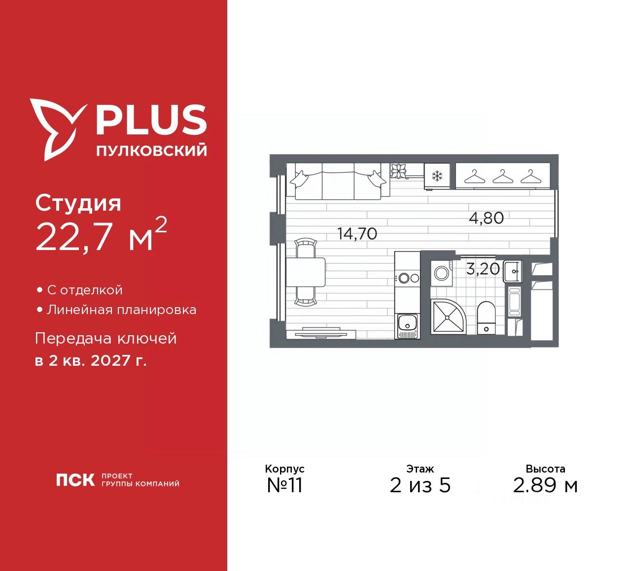Просторная однокомнатная квартира-студия с отделкой в ЖК ''PLUS Пулковский'' на 2 этаже. Общая площадь: 22.7 кв.м., площадь гостиной 14.7 кв.м., из которых 5 кв.м. выделено под кухонную зону. Все окна выходят на одну сторону. В квартире один совмещенный санузел. Высота потолков 2.89 м.