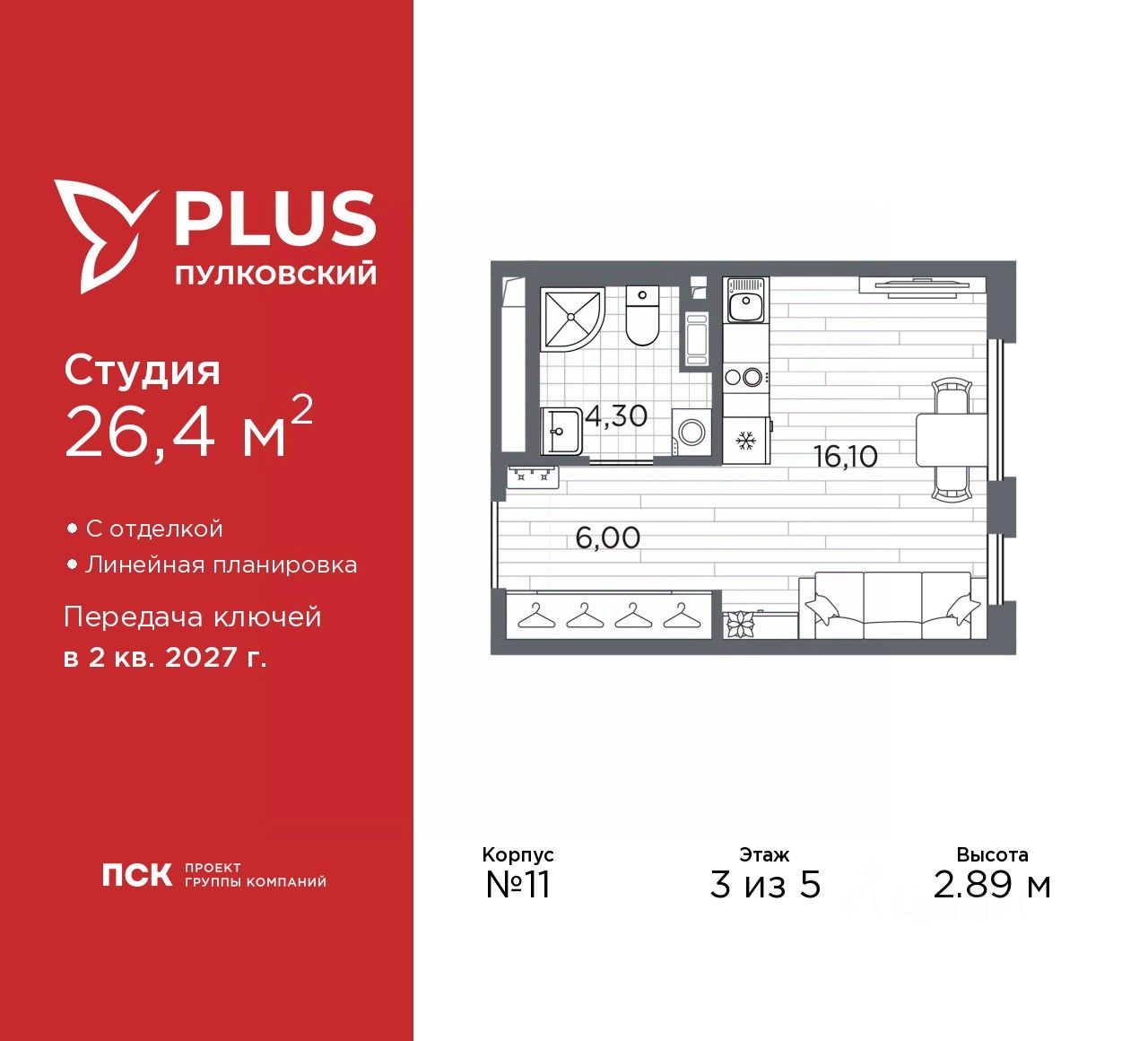Продается 1-комн. квартира-студия с отделкой в ЖК ''PLUS Пулковский'' на 3 этаже. Общая площадь: 26.4 кв.м., площадь гостиной 16.1 кв.м., из которых 5 кв.м. выделено под кухонную зону. Все окна выходят на одну сторону. В квартире один совмещенный санузел. Высота потолков 2.89 м.