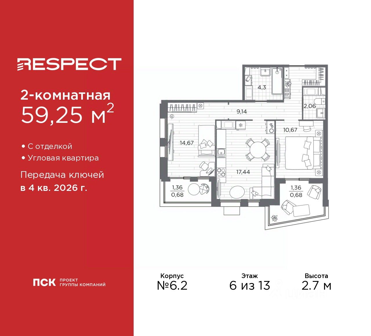 Двухкомнатная квартира с отделкой в ЖК ''RESPECT'' на 6 этаже. Общая площадь: 59.25 кв.м., жилая: 25.34 кв.м., площадь просторной кухни-столовой: 17.44 кв.м. Угловая квартира, идеально подойдет любителям тишины и панорамных видов. В квартире две лоджии, один совмещенный и один раздельный санузел. Высота потолков 2.7 м.