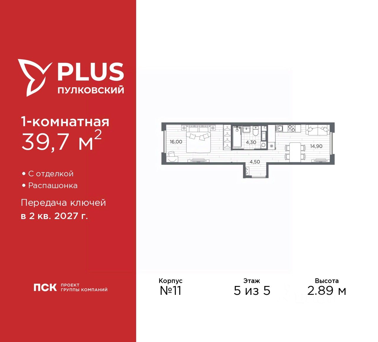 Однокомнатная квартира с отделкой в ЖК ''PLUS Пулковский'' на 5 этаже. Общая площадь: 39.7 кв.м., жилая: 16 кв.м., площадь просторной кухни-столовой: 14.9 кв.м. Квартира - распашонка, без проходных комнат, окна выходят на paзные стороны дома. В квартире один совмещенный санузел. Высота потолков 2.89 м.