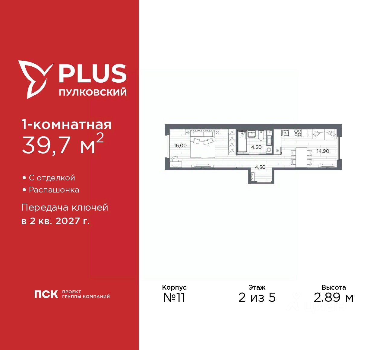 1-комн. квартира от застройщика с отделкой в ЖК ''PLUS Пулковский'' на 2 этаже. Общая площадь: 39.7 кв.м., жилая: 16 кв.м., площадь просторной кухни-столовой: 14.9 кв.м. Квартира - распашонка, без проходных комнат, окна выходят на paзные стороны дома. В квартире один совмещенный санузел. Высота потолков 2.89 м.