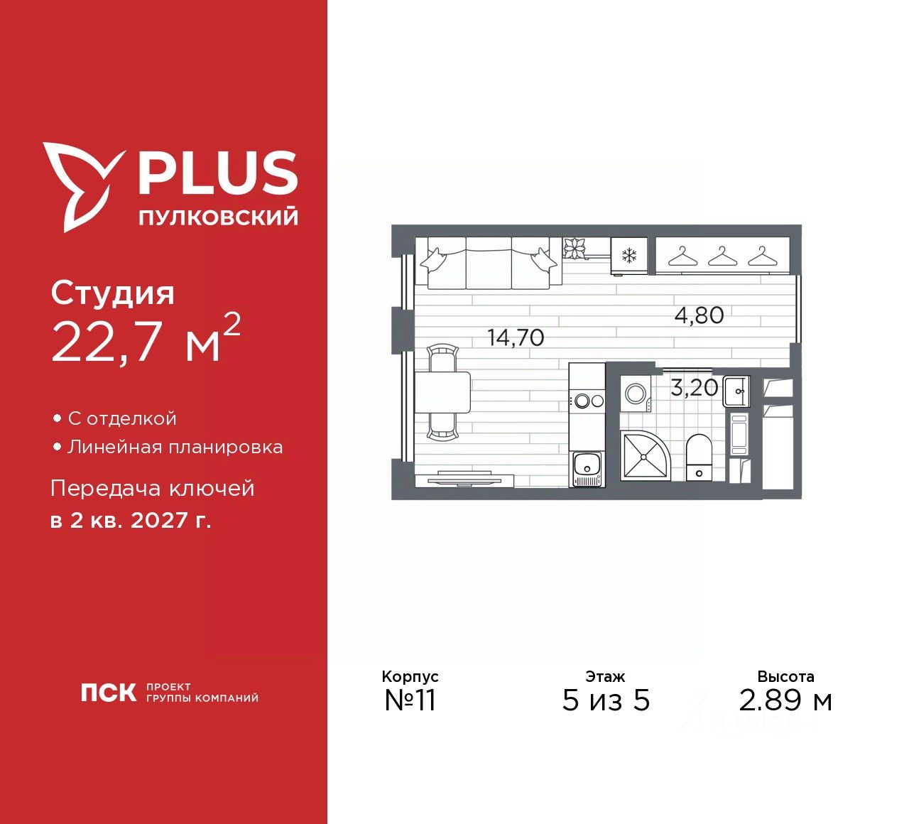 Просторная однокомнатная квартира-студия с отделкой в ЖК ''PLUS Пулковский'' на 5 этаже. Общая площадь: 22.7 кв.м., площадь гостиной 14.7 кв.м., из которых 5 кв.м. выделено под кухонную зону. Все окна выходят на одну сторону. В квартире один совмещенный санузел. Высота потолков 2.89 м.