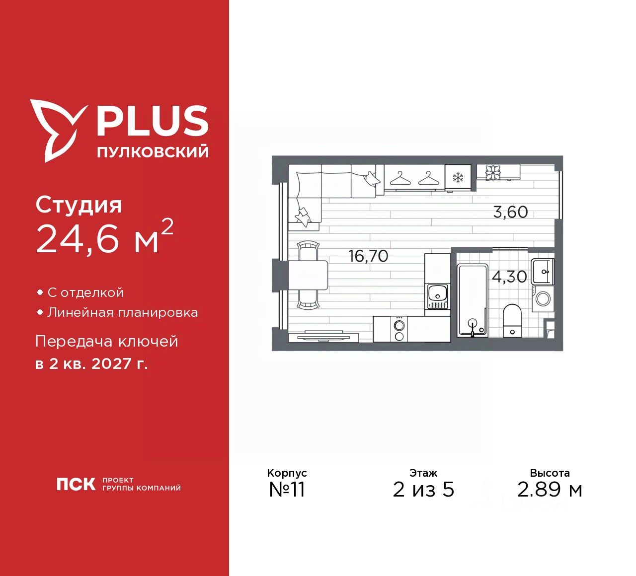1-комн. квартира-студия от застройщика с отделкой в ЖК ''PLUS Пулковский'' на 2 этаже. Общая площадь: 24.6 кв.м., площадь гостиной 16.7 кв.м., из которых 5 кв.м. выделено под кухонную зону. Все окна выходят на одну сторону. В квартире один совмещенный санузел. Высота потолков 2.89 м.
