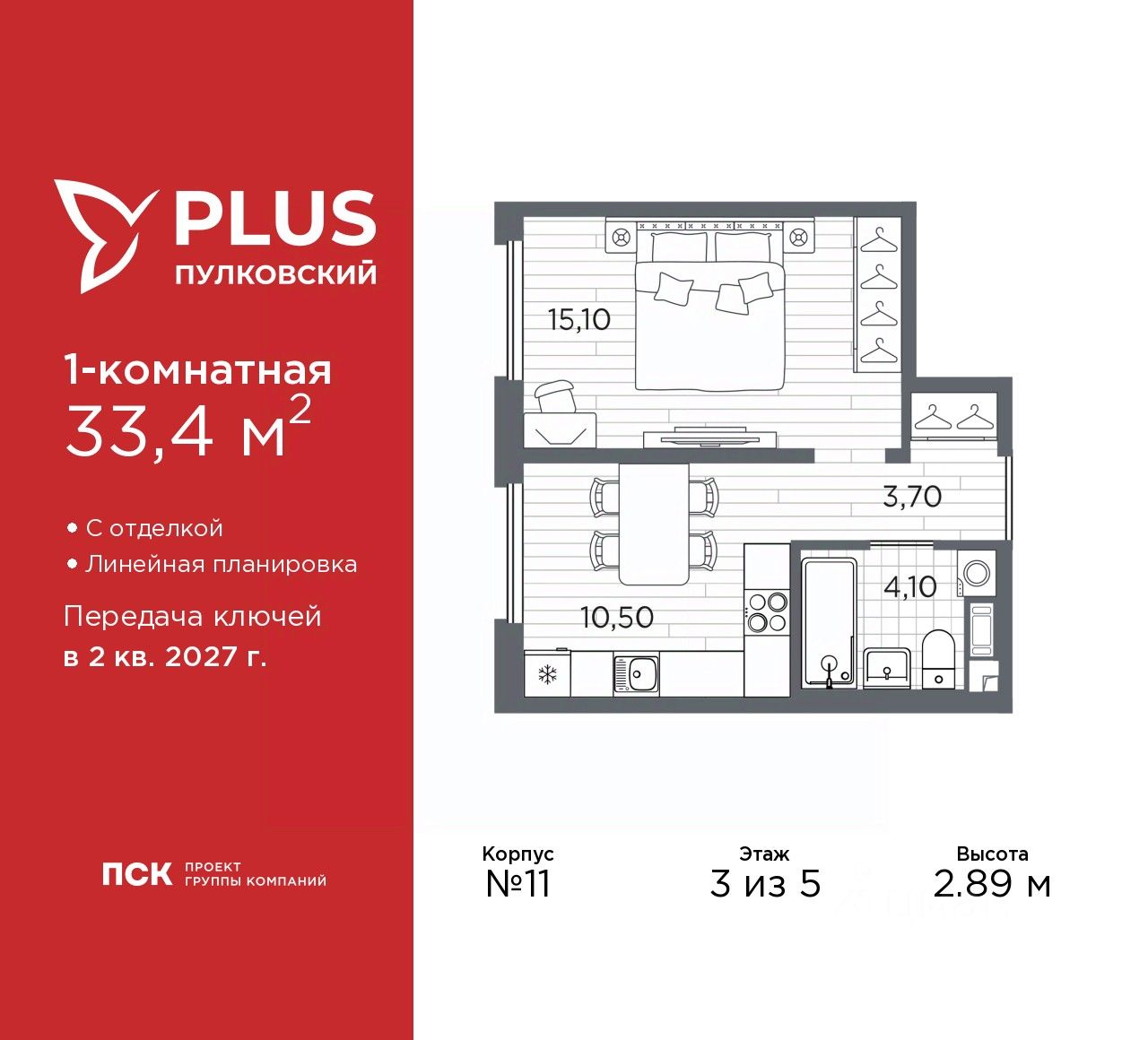 1-комн. квартира с отделкой в ЖК ''PLUS Пулковский'' на 3 этаже. Общая площадь: 33.4 кв.м., жилая: 15.1 кв.м., площадь просторной кухни-столовой: 10.5 кв.м. Все окна выходят на одну сторону. В квартире один совмещенный санузел. Высота потолков 2.89 м.