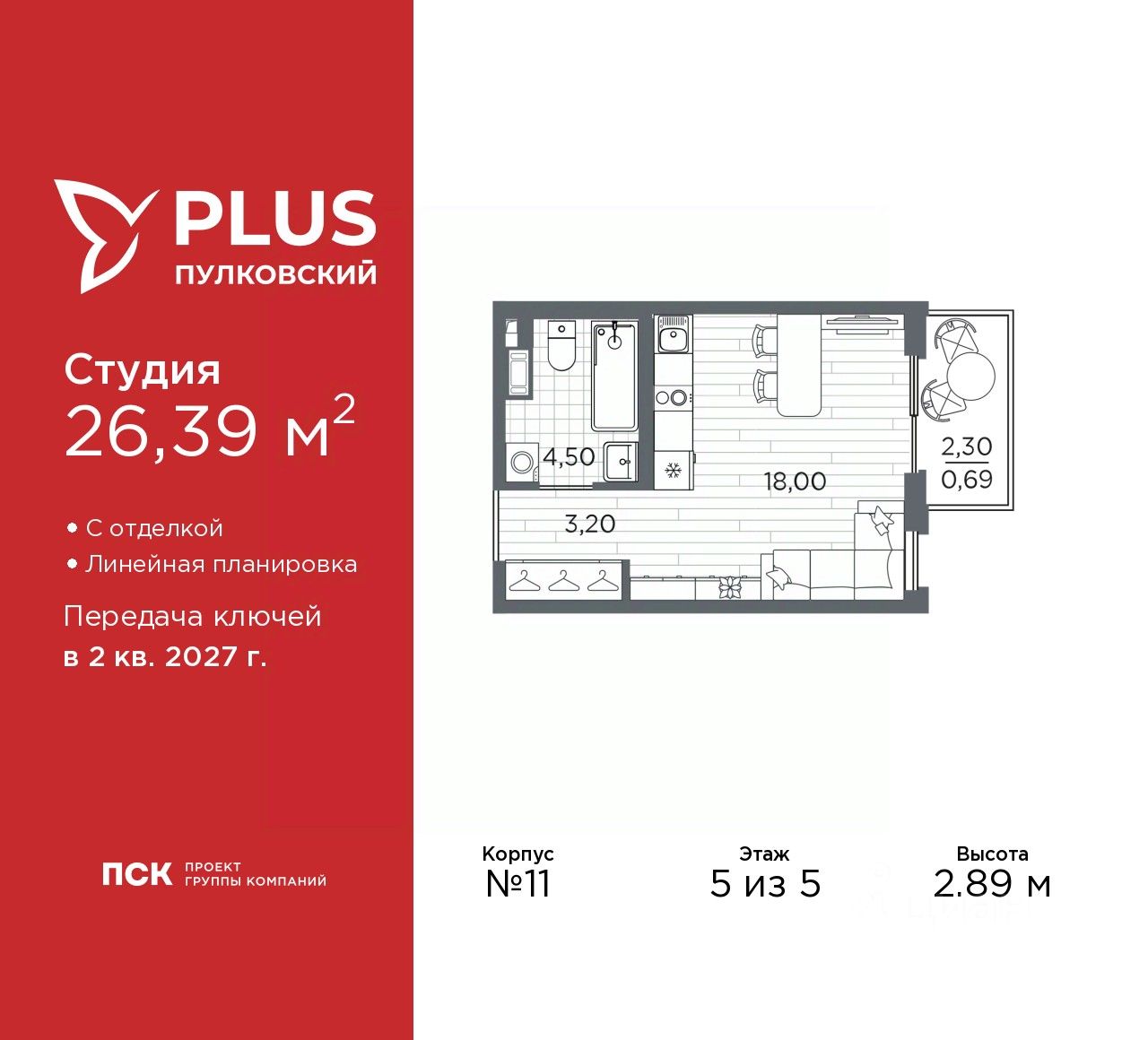 Просторная 1-комн. квартира-студия с отделкой в ЖК ''PLUS Пулковский'' на 5 этаже. Общая площадь: 26.39 кв.м., площадь гостиной 18 кв.м., из которых 5 кв.м. выделено под кухонную зону. Все окна выходят на одну сторону. В квартире один балкон, один совмещенный санузел. Высота потолков 2.89 м.