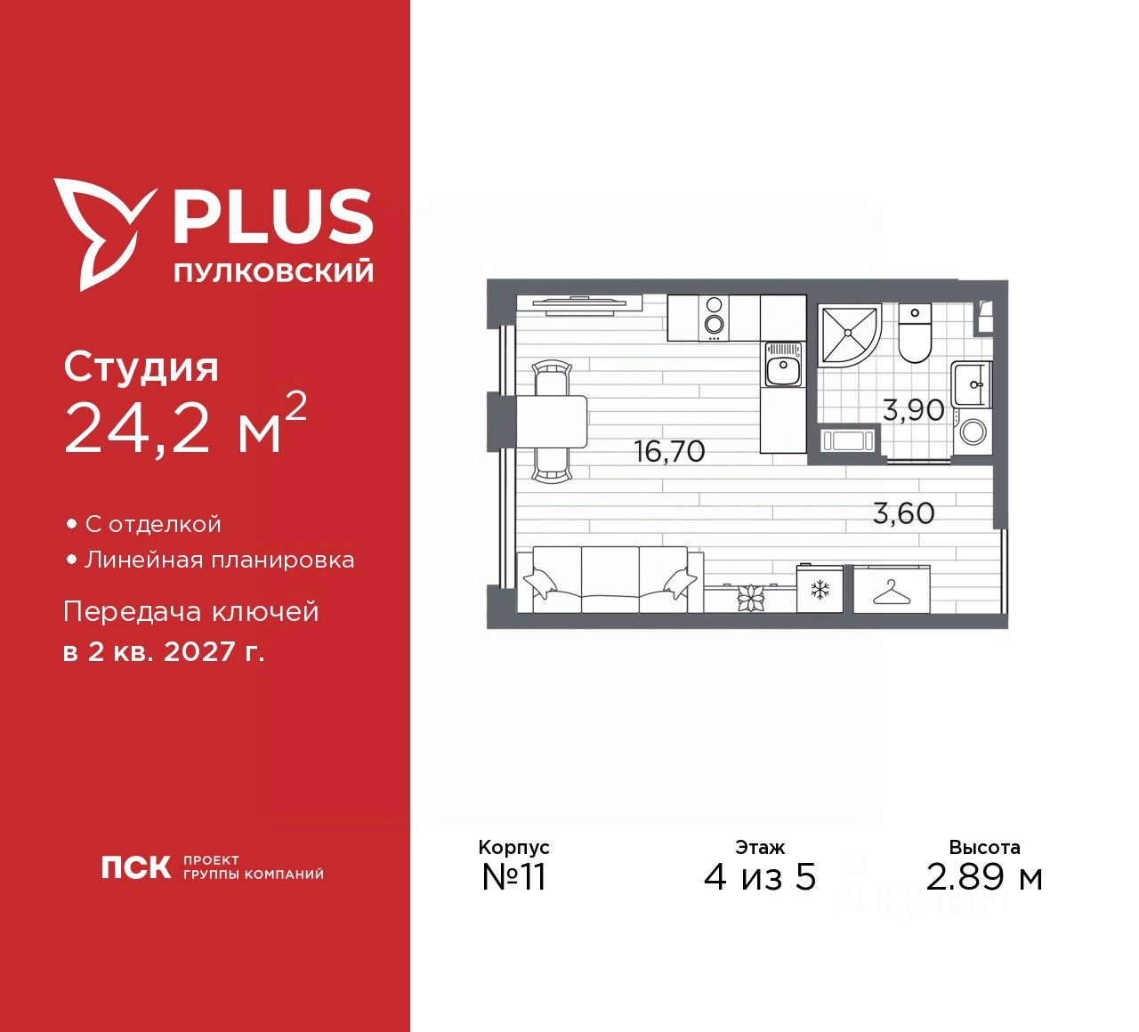1-комн. квартира-студия от застройщика с отделкой в ЖК ''PLUS Пулковский'' на 4 этаже. Общая площадь: 24.2 кв.м., площадь гостиной 16.7 кв.м., из которых 5 кв.м. выделено под кухонную зону. Все окна выходят на одну сторону. В квартире один совмещенный санузел. Высота потолков 2.89 м.