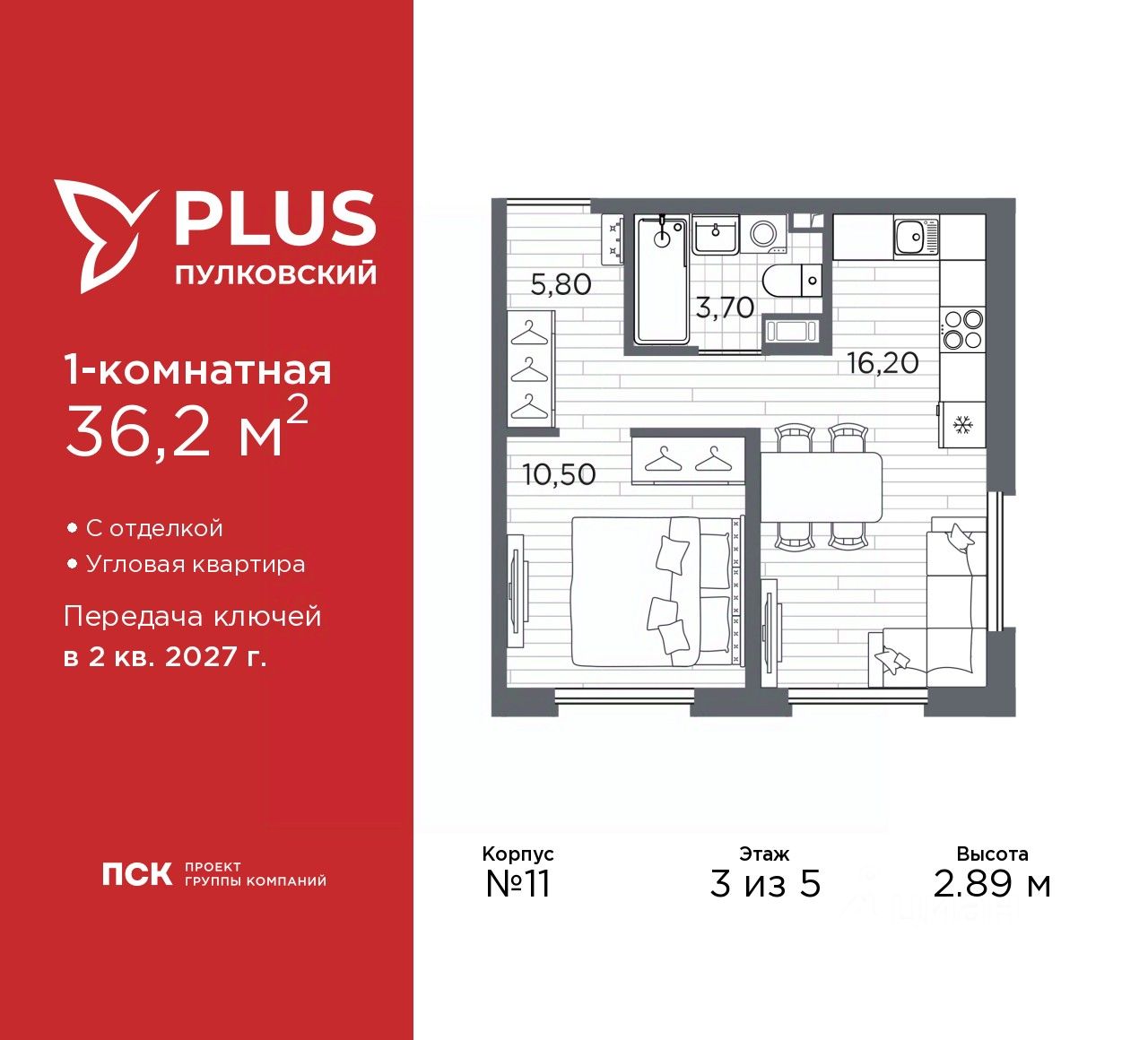 Однокомнатная квартира с отделкой в ЖК ''PLUS Пулковский'' на 3 этаже. Общая площадь: 36.2 кв.м., жилая: 10.5 кв.м., площадь просторной кухни-столовой: 16.2 кв.м. Квартира угловая, окна oбecпeчивaют paвнoмepнoe ocвeщeниe в тeчeниe дня. В квартире один совмещенный санузел. Высота потолков 2.89 м.