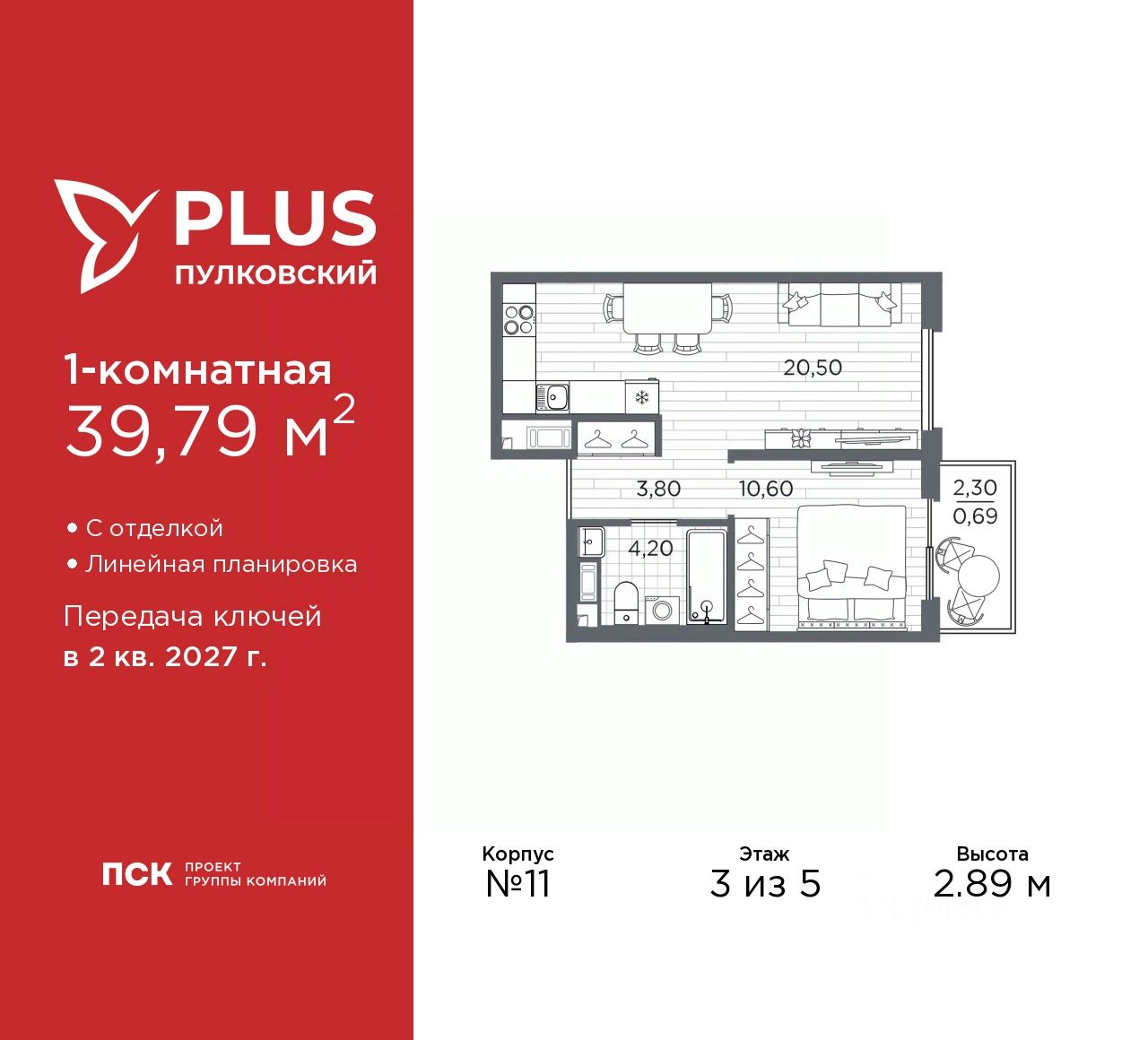 1-комн. квартира от застройщика с отделкой в ЖК ''PLUS Пулковский'' на 3 этаже. Общая площадь: 39.79 кв.м., жилая: 10.6 кв.м., площадь просторной кухни-столовой: 20.5 кв.м. Все окна выходят на одну сторону. В квартире один балкон, один совмещенный санузел. Высота потолков 2.89 м.