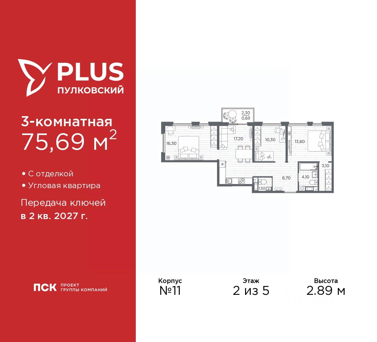 3-комн. квартира с отделкой в ЖК ''PLUS Пулковский'' на 2 этаже. Общая площадь: 75.69 кв.м., жилая: 40.4 кв.м., площадь просторной кухни-столовой: 17.2 кв.м. Квартира угловая, идеально подойдет любителям тишины и панорамных видов. В квартире один балкон, один совмещенный и один раздельный санузел. Высота потолков 2.89 м.