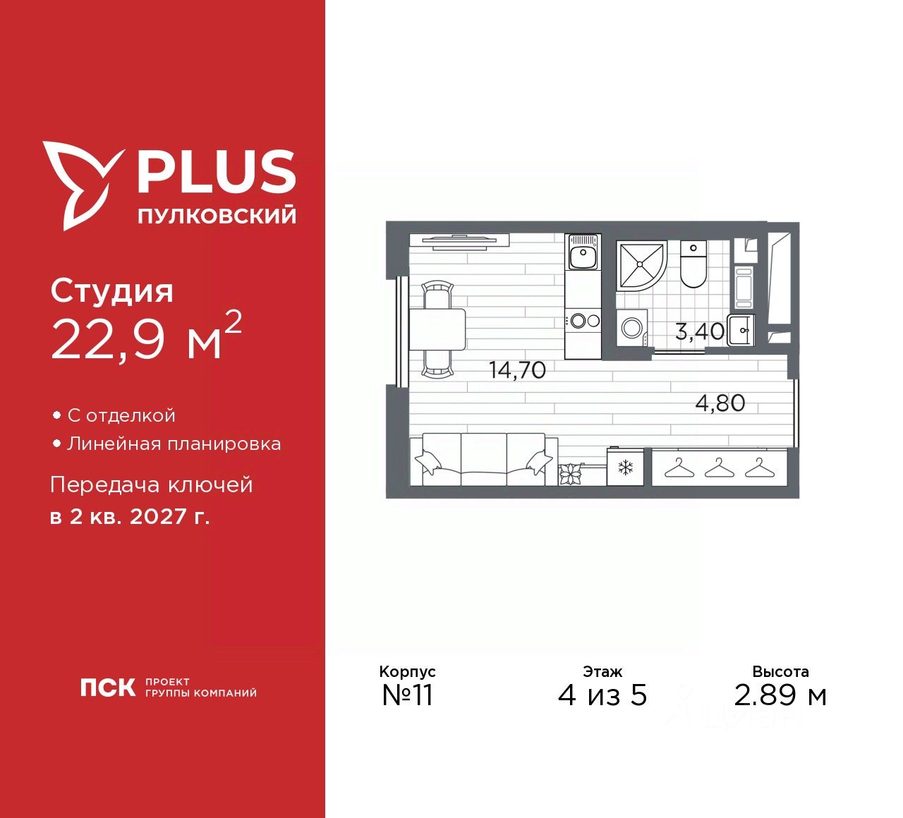Продается 1-комн. квартира-студия с отделкой в ЖК ''PLUS Пулковский'' на 4 этаже. Общая площадь: 22.9 кв.м., площадь гостиной 14.7 кв.м., из которых 5 кв.м. выделено под кухонную зону. Все окна выходят на одну сторону. В квартире один совмещенный санузел. Высота потолков 2.89 м.