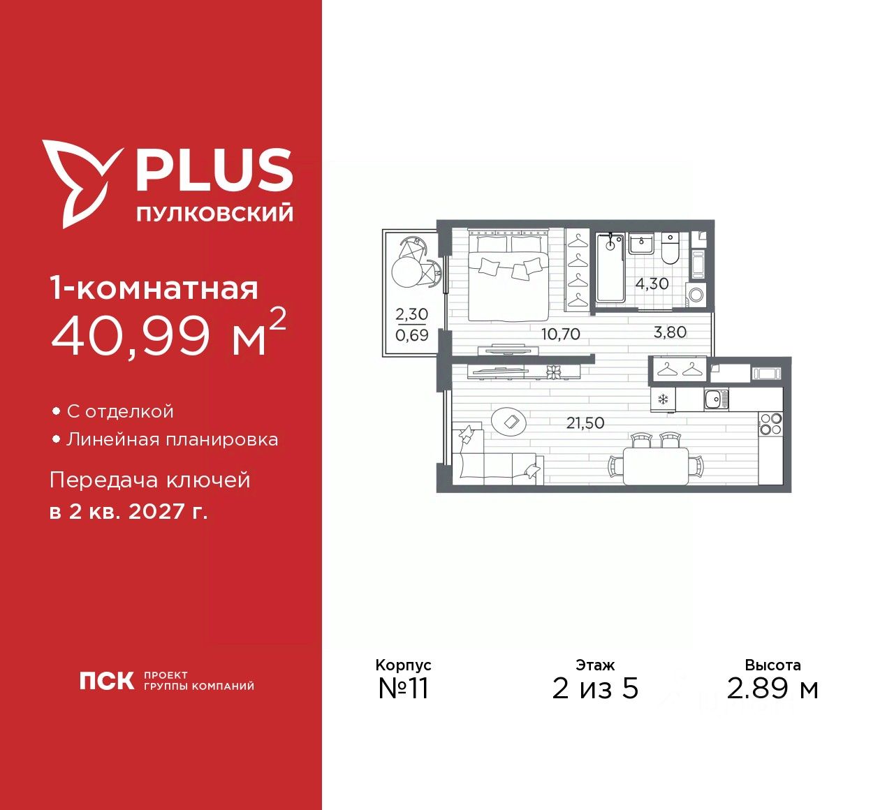 Просторная 1-комн. квартира с отделкой в ЖК ''PLUS Пулковский'' на 2 этаже. Общая площадь: 40.99 кв.м., жилая: 10.7 кв.м., площадь просторной кухни-столовой: 21.5 кв.м. Все окна выходят на одну сторону. В квартире один балкон, один совмещенный санузел. Высота потолков 2.89 м.