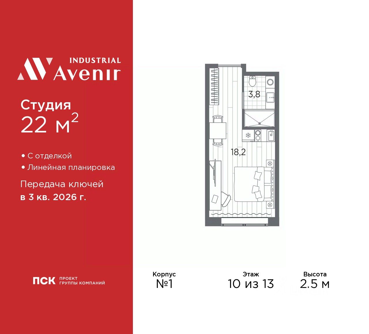 Продаются 1-комн. апартаменты-студия с отделкой в ЖК ''Industrial AVENIR'' на 10 этаже. Общая площадь: 22 кв.м., площадь гостиной 18.2 кв.м., из которых 5 кв.м. выделено под кухонную зону. Все окна выходят на одну сторону. В апартаментах один совмещенный санузел. Высота потолков 2.5 м.