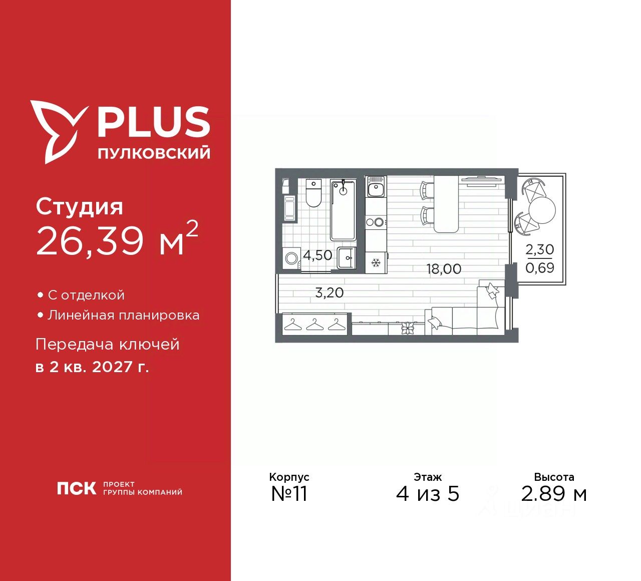 1-комн. квартира-студия с отделкой в ЖК ''PLUS Пулковский'' на 4 этаже. Общая площадь: 26.39 кв.м., площадь гостиной 18 кв.м., из которых 5 кв.м. выделено под кухонную зону. Все окна выходят на одну сторону. В квартире один балкон, один совмещенный санузел. Высота потолков 2.89 м.