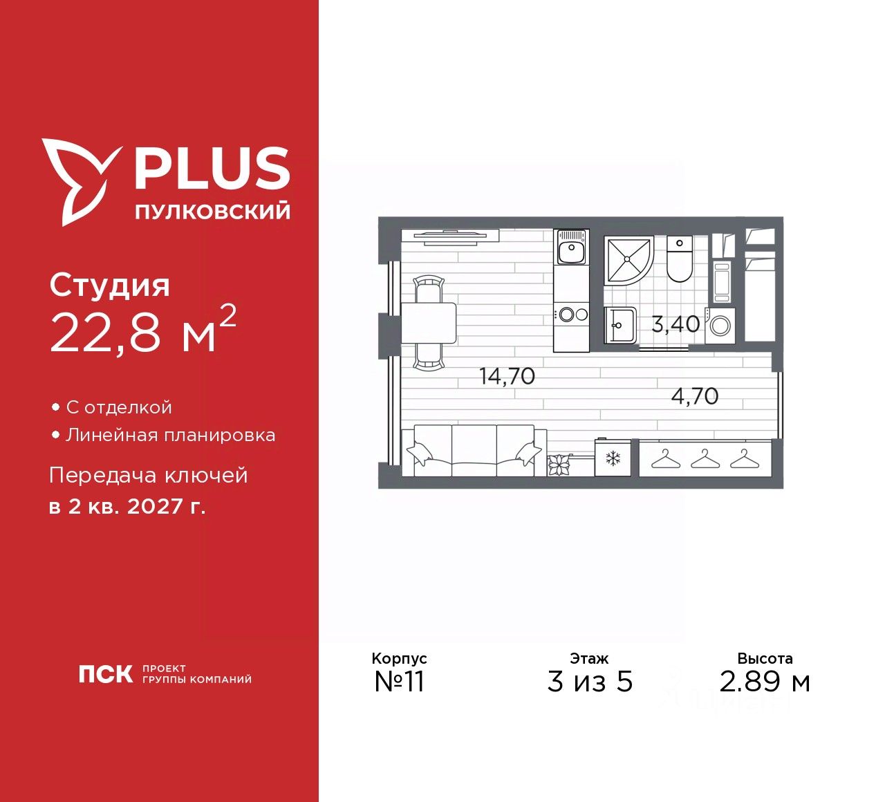 Однокомнатная квартира-студия от застройщика с отделкой в ЖК ''PLUS Пулковский'' на 3 этаже. Общая площадь: 22.8 кв.м., площадь гостиной 14.7 кв.м., из которых 5 кв.м. выделено под кухонную зону. Все окна выходят на одну сторону. В квартире один совмещенный санузел. Высота потолков 2.89 м.