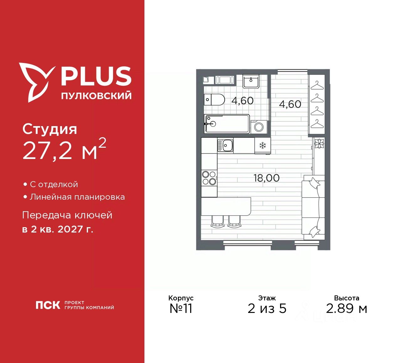 Продается однокомнатная квартира-студия от застройщика с отделкой в ЖК ''PLUS Пулковский'' на 2 этаже. Общая площадь: 27.2 кв.м., площадь гостиной 18 кв.м., из которых 5 кв.м. выделено под кухонную зону. Все окна выходят на одну сторону. В квартире один совмещенный санузел. Высота потолков 2.89 м.