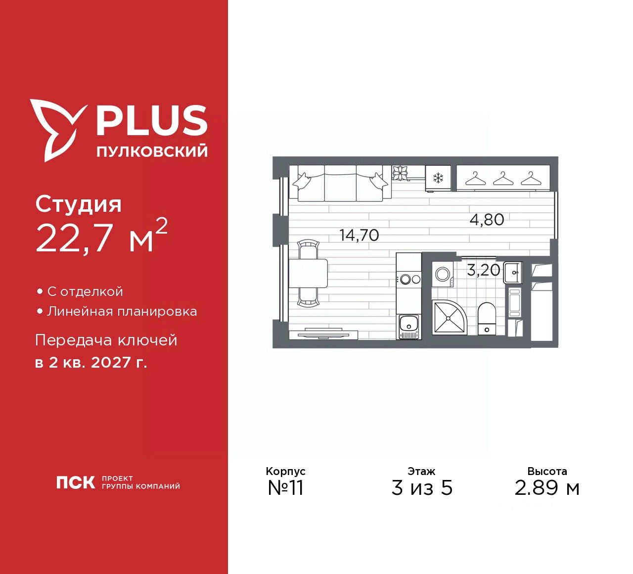 1-комн. квартира-студия с отделкой в ЖК ''PLUS Пулковский'' на 3 этаже. Общая площадь: 22.7 кв.м., площадь гостиной 14.7 кв.м., из которых 5 кв.м. выделено под кухонную зону. Все окна выходят на одну сторону. В квартире один совмещенный санузел. Высота потолков 2.89 м.