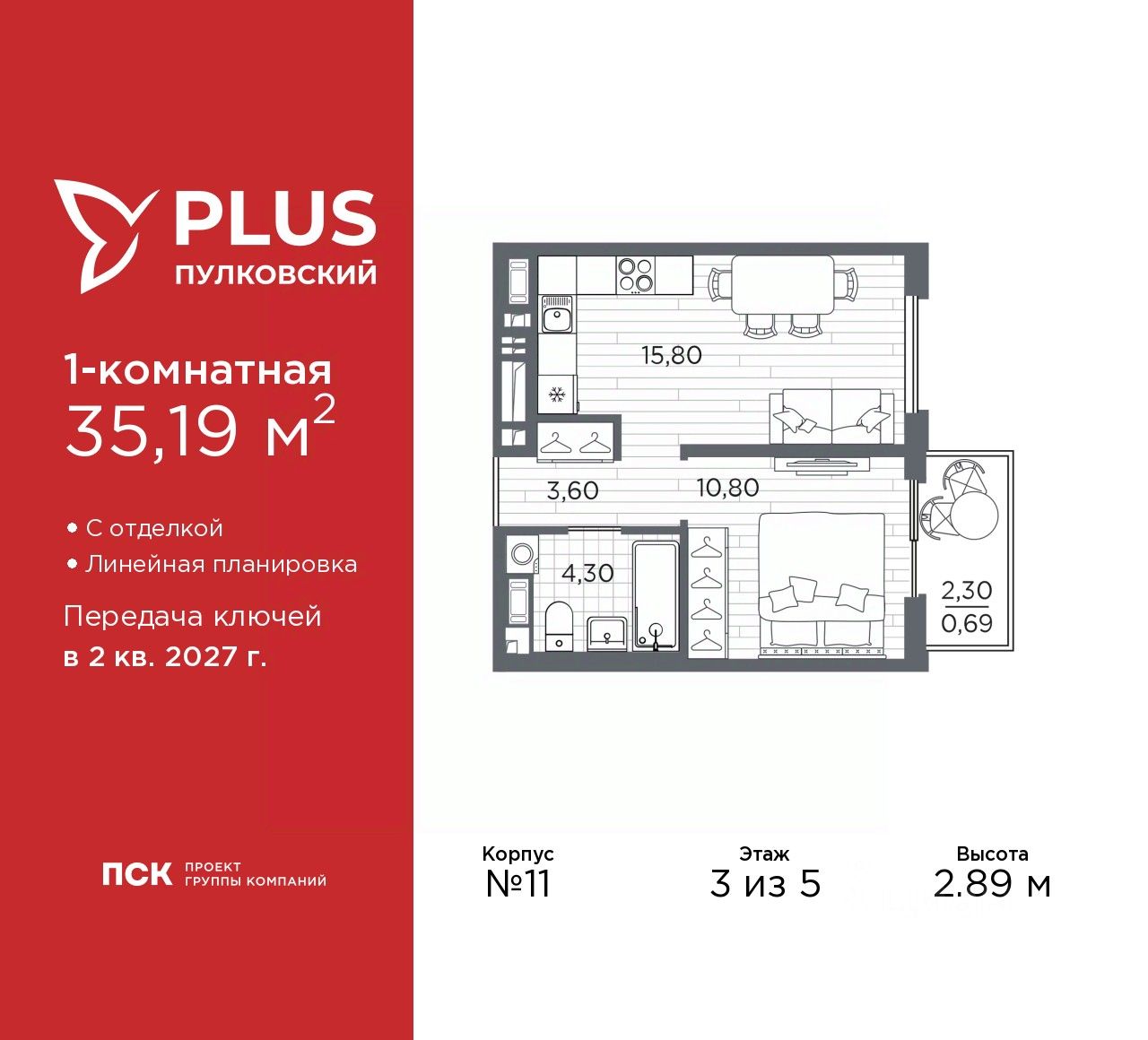 1-комн. квартира от застройщика с отделкой в ЖК ''PLUS Пулковский'' на 3 этаже. Общая площадь: 35.19 кв.м., жилая: 10.8 кв.м., площадь просторной кухни-столовой: 15.8 кв.м. Все окна выходят на одну сторону. В квартире один балкон, один совмещенный санузел. Высота потолков 2.89 м.