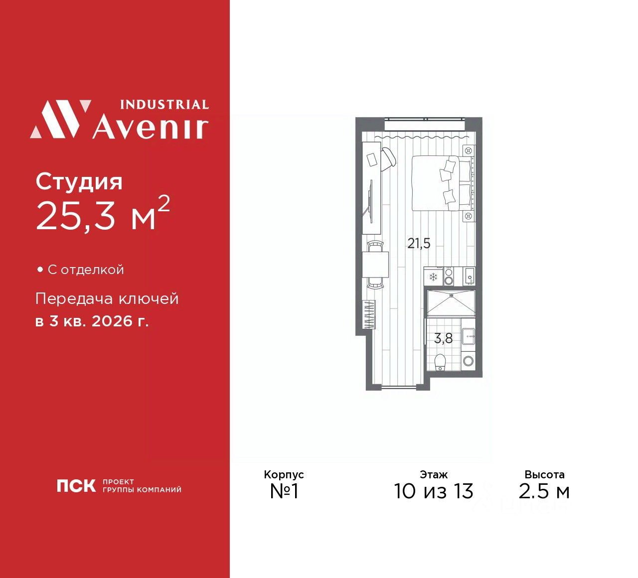 1-комн. апартаменты-студия с отделкой в ЖК ''Industrial AVENIR'' на 10 этаже. Общая площадь: 25.3 кв.м., площадь гостиной 21.5 кв.м., из которых 5 кв.м. выделено под кухонную зону. Все окна выходят на одну сторону. В апартаментах один совмещенный санузел. Высота потолков 2.5 м.